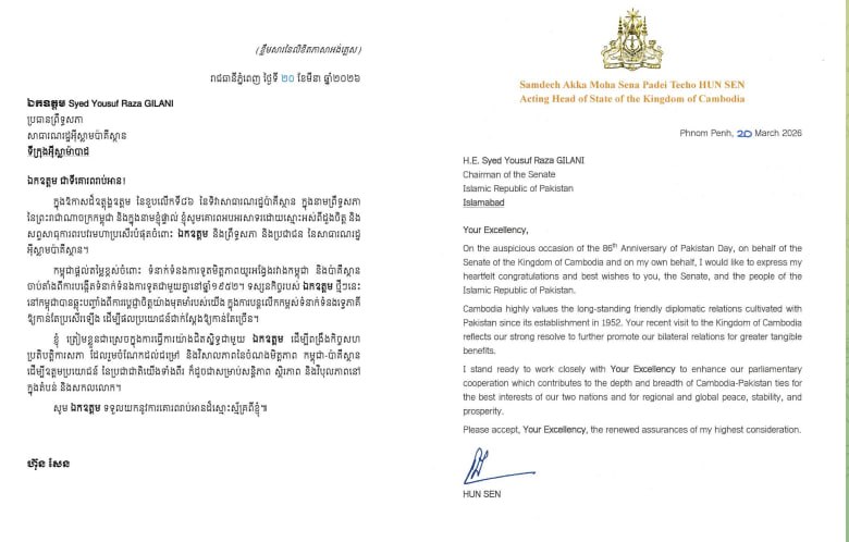 AKP Phnom Penh, March 20, 2026 -- Acting Head of State Samdech Akka Moha Sena Padei Techo HUN Sen has highlighted Cambodia’s commitment to further boosting the bilateral relations with Pakistan, in his congratulatory message on the Pakistan Day. “On the ausp...