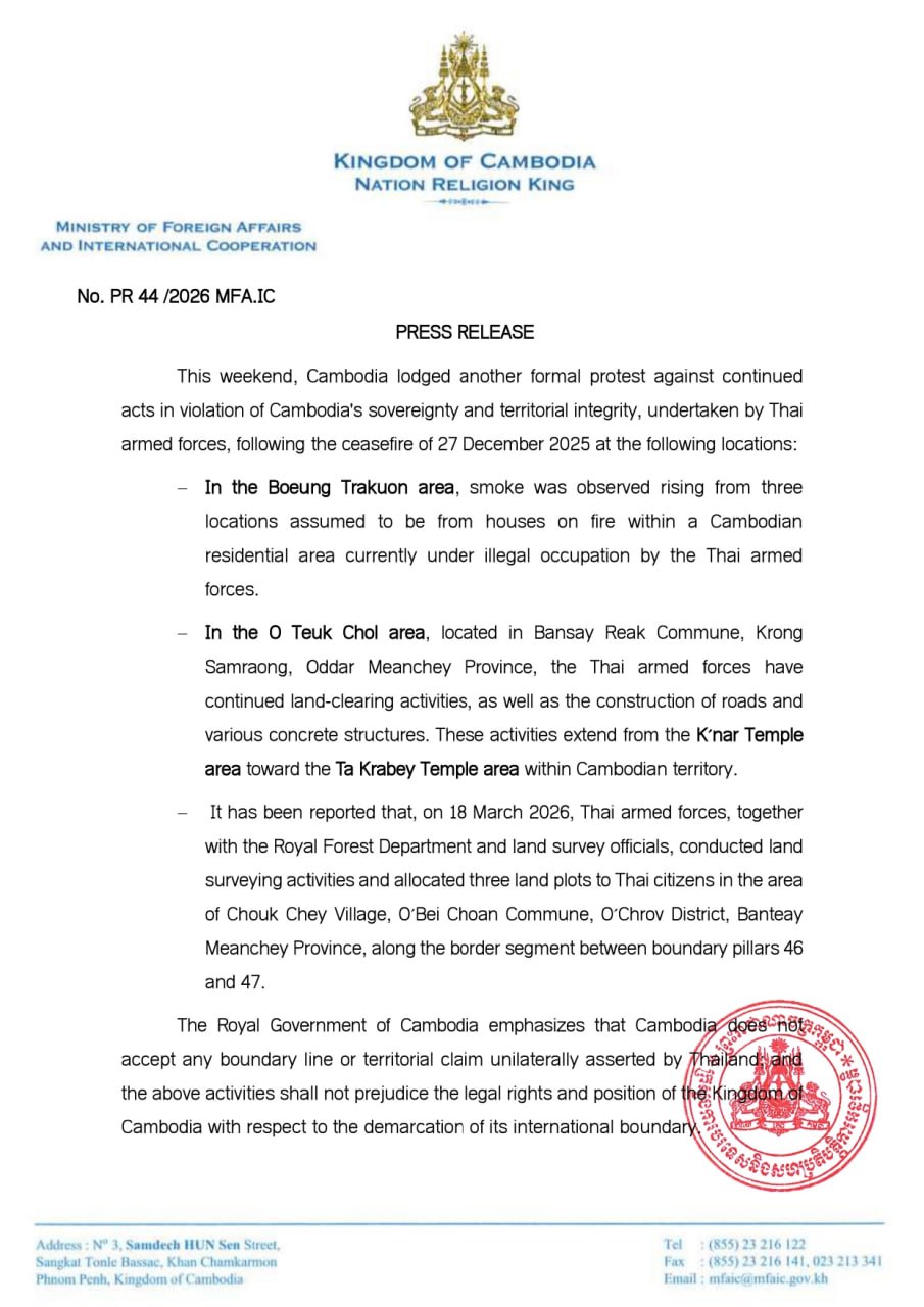 AKP Phnom Penh, March 21, 2026 -- The Royal Government of Cambodia has lodged another formal protest against continued violations of its sovereignty and territorial integrity by Thai armed forces, despite the ceasefire agreed on Dec. 27, 2025. According to a press...