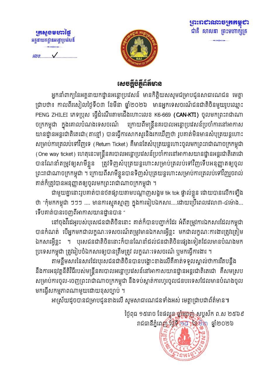 AKP Phnom Penh, March 20, 2026 -- The General Department of Immigration (GDI) under the Ministry of Interior has issued a clarification regarding a recent case involving a Chinese tourist at Techo International Airport. According to the GDI’s spokesperson, on the...