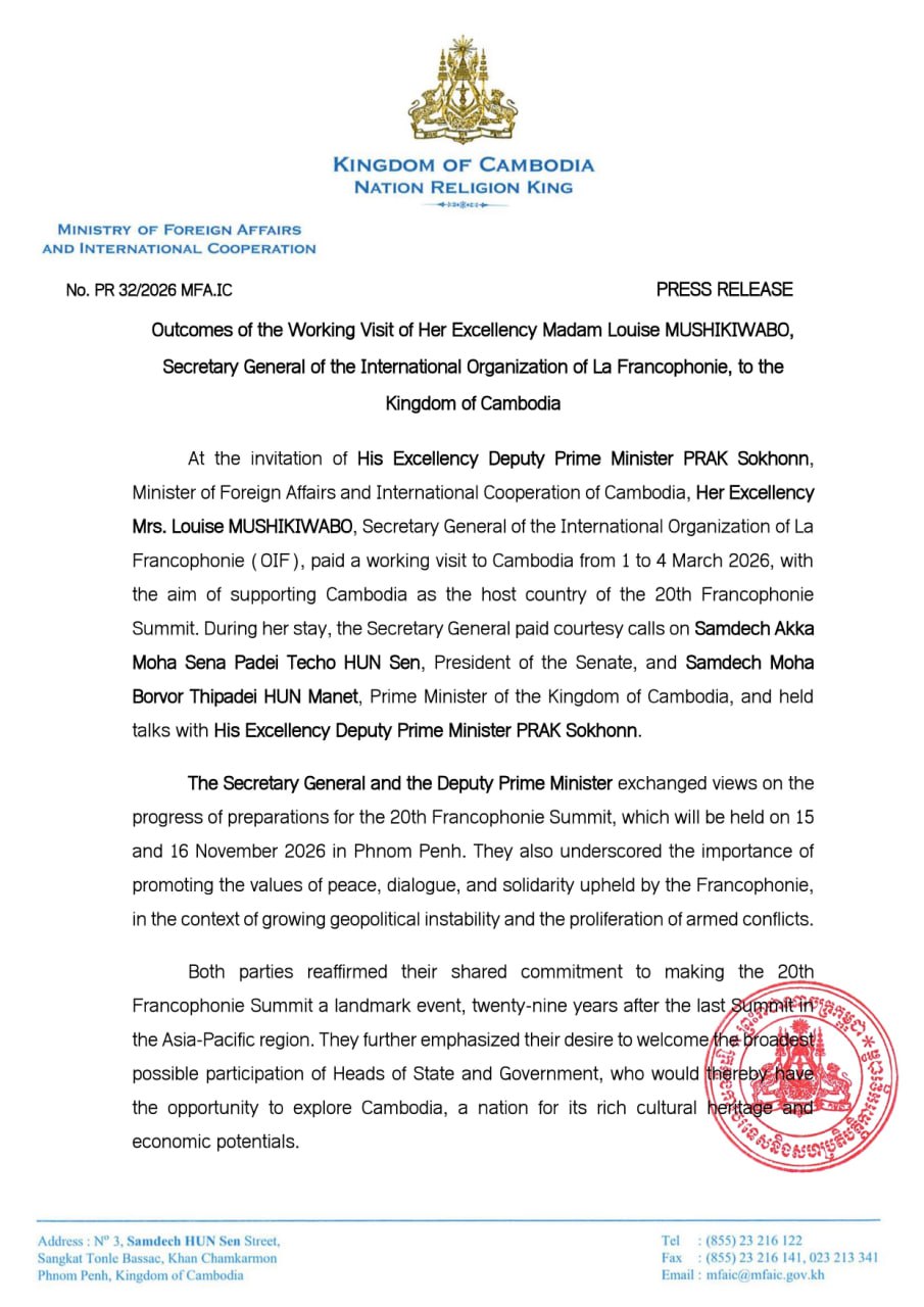 AKP Phnom Penh, March 09, 2026 -- The following are the outcomes of the recent working visit of H.E. Madam Louise MUSHIKIWABO, Secretary General of the International Organisation of La Francophonie, to the Kingdom of Cambodia: