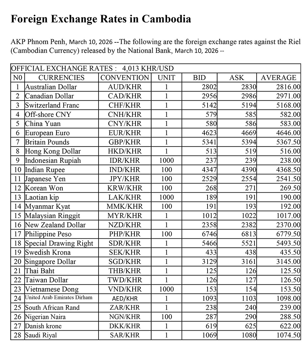 AKP Phnom Penh, March 10, 2026 --The following are the foreign exchange rates against the Riel (Cambodian Currency) released by the National Bank, March 10, 2026