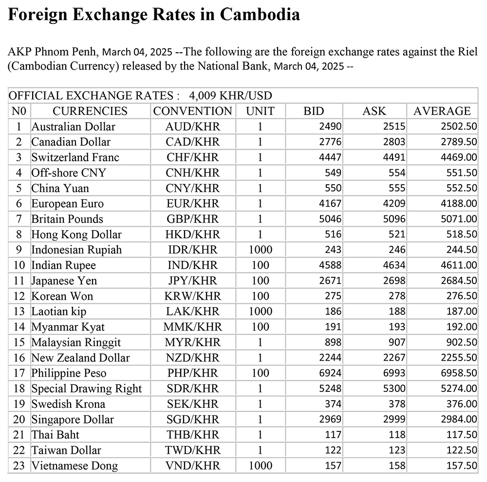 AKP Phnom Penh, March 04, 2025 --The following are the foreign exchange rates against the Riel (Cambodian Currency) released by the National Bank, March 04, 2025 --