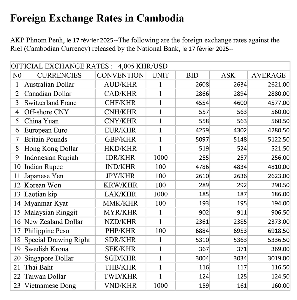 AKP Phnom Penh, February 17, 2025 -- The following are the foreign exchange rates against the Riel (Cambodian Currency) released by the National Bank, February 17, 2025.
