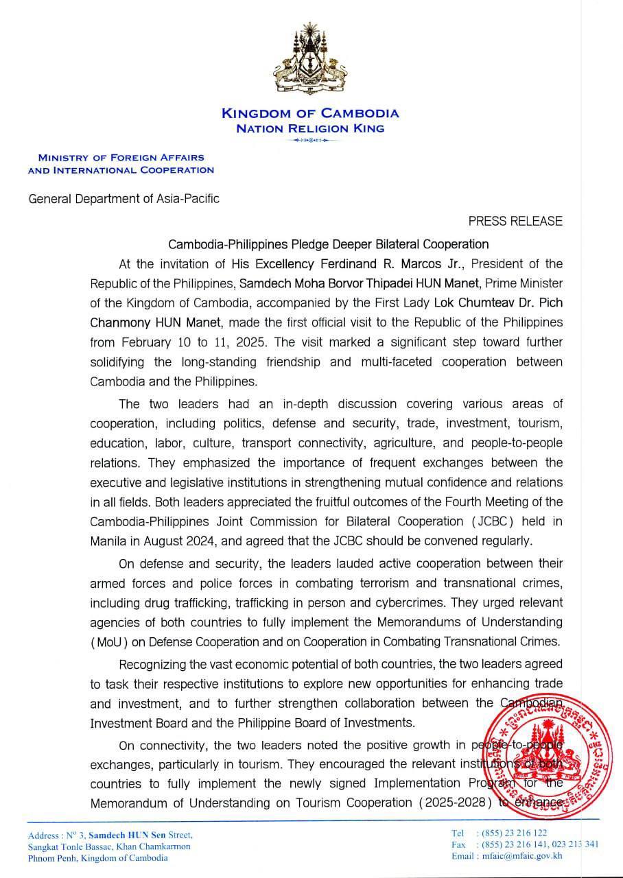 AKP Phnom Penh, February 11, 2025 -- The Cambodian Ministry of Foreign Affairs and International Cooperation this evening made public a press release, highlighting the fruitful outcomes of the two-day official visit of Cambodian Prime Minister Samdech Moha Borvor Thi...