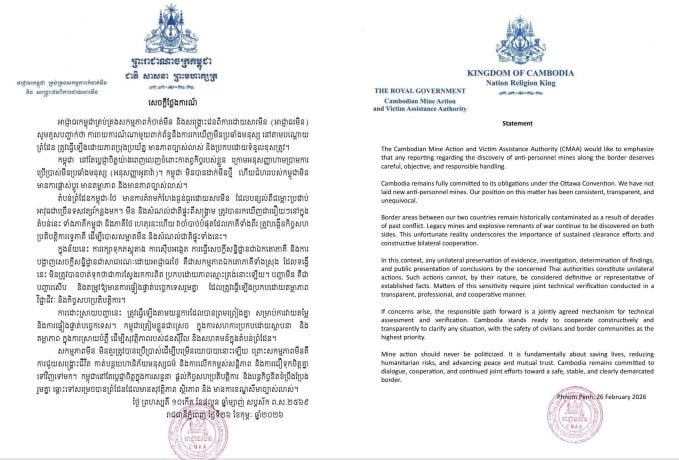 AKP Phnom Penh, February 26, 2026 -- The Cambodian Mine Action and Victim Assistance Authority (CMAA) has called for careful, objective, and responsible handling of reports concerning the discovery of anti-personnel mines along the Cambodia-Thailand border. In a s...