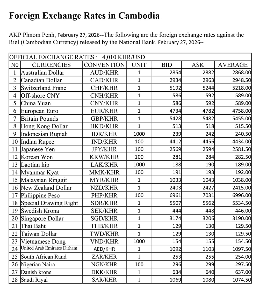 AKP Phnom Penh, February 27, 2026--The following are the foreign exchange rates against the Riel (Cambodian Currency) released by the National Bank, February 27, 2026--