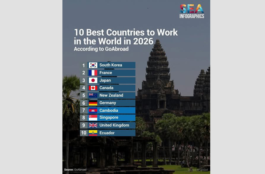 AKP Phnom Penh, February 25, 2026 -- Cambodia was placed 7th among the “Best Countries to Work Abroad in 2026,” according to the Ministry of Tourism. This ranking was evaluated and compiled by GoAbroad, highlighting destinations that stand out for job opportunitie...