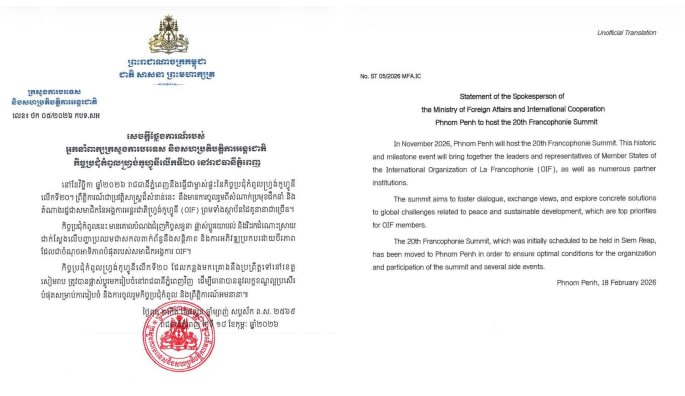 AKP Phnom Penh, February 18, 2026 -- Phnom Penh capital will host the 20th Francophonie Summit in November this year, stated the Spokesperson of the Ministry of Foreign Affairs and International Cooperation. In a statement released this evening, the spokesperson e...