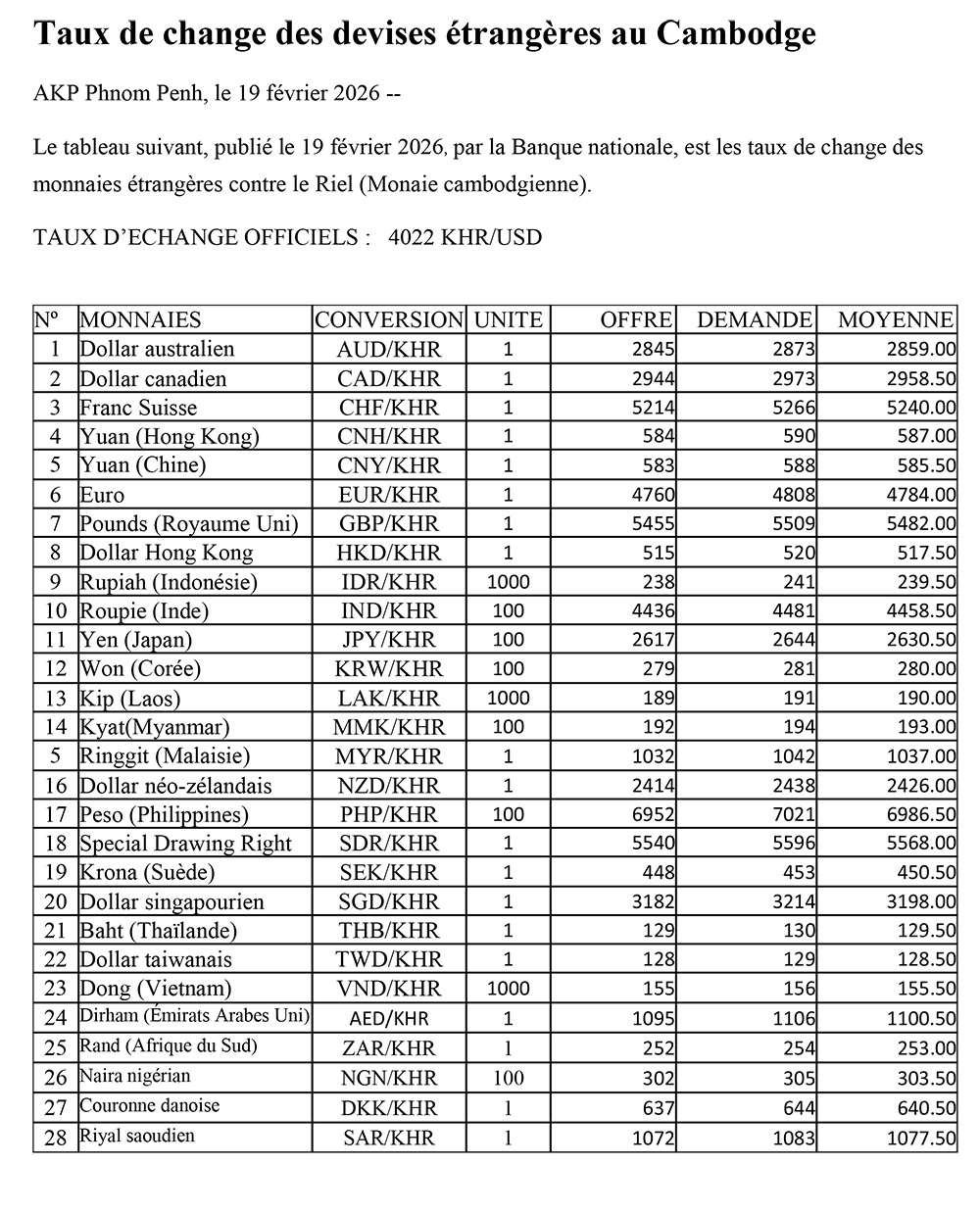 AKP Phnom Penh, February 19, 2026--The following are the foreign exchange rates against the Riel (Cambodian Currency) released by the National Bank, February 19, 2026--