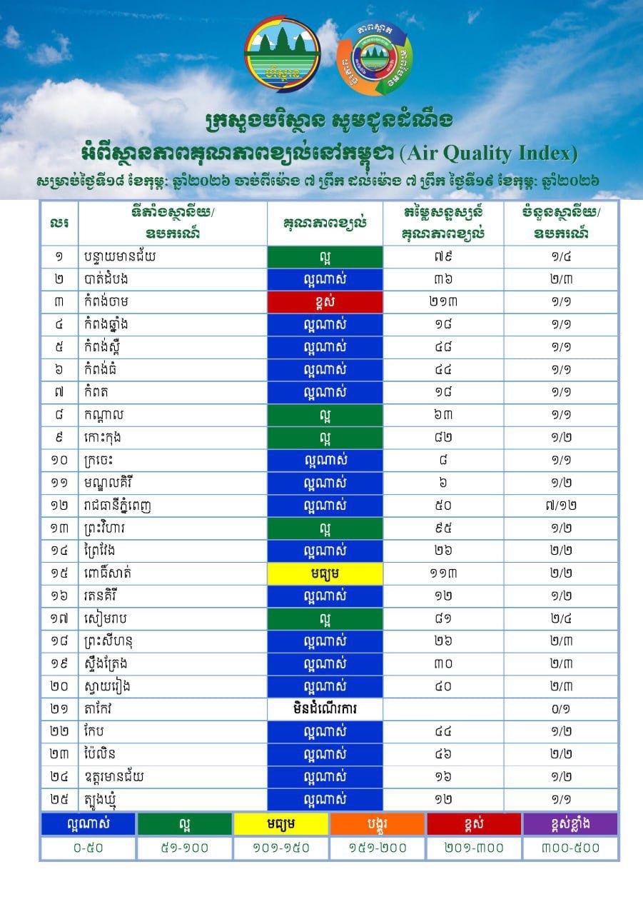 AKP Phnom Penh, February 19, 2026 -- Air quality in Cambodia remained “Good” from 7:00 a.m. on Feb. 18 to 7:00 a.m. on Feb. 19, 2026, confirmed the Ministry of Environment. According to the Ministry, the average concentration of particulate matter during this peri...