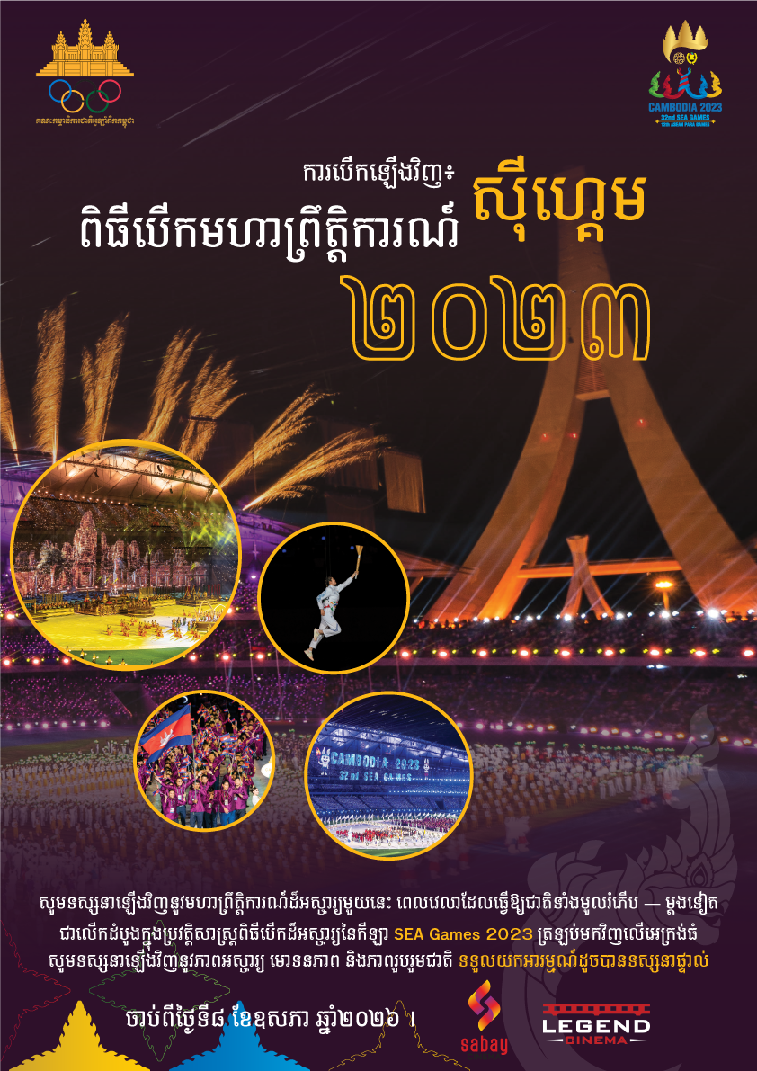 AKP ភ្នំពេញ ថ្ងៃទី២៤ ខែមេសា ឆ្នាំ២០២៦--គណៈកម្មាធិការជាតិអូឡាំពិកកម្ពុជា (NOCC) បានប្រកាសជូនដំណឹងស្តីពីការរៀបចំផ្សព្វផ្សាយកម្មវិធីបើក SEA Games ឆ្នាំ២០២៣ ដោយនឹងចាក់បញ្ចាំងឡើងវិញ នៅក្នុងរោងភាពយន្តខ្នាតធំត្រជាក់ភ្នែក ផ្តល់ភាពរំភើបដូច បានទស្សនាផ្ទាល់ កាលពីថ្ងៃទី៥ ខែឧសភា ឆ្នាំ២០២៣ ដែលជាខួប៣ឆ្នាំនៃព្រឹត្ត...