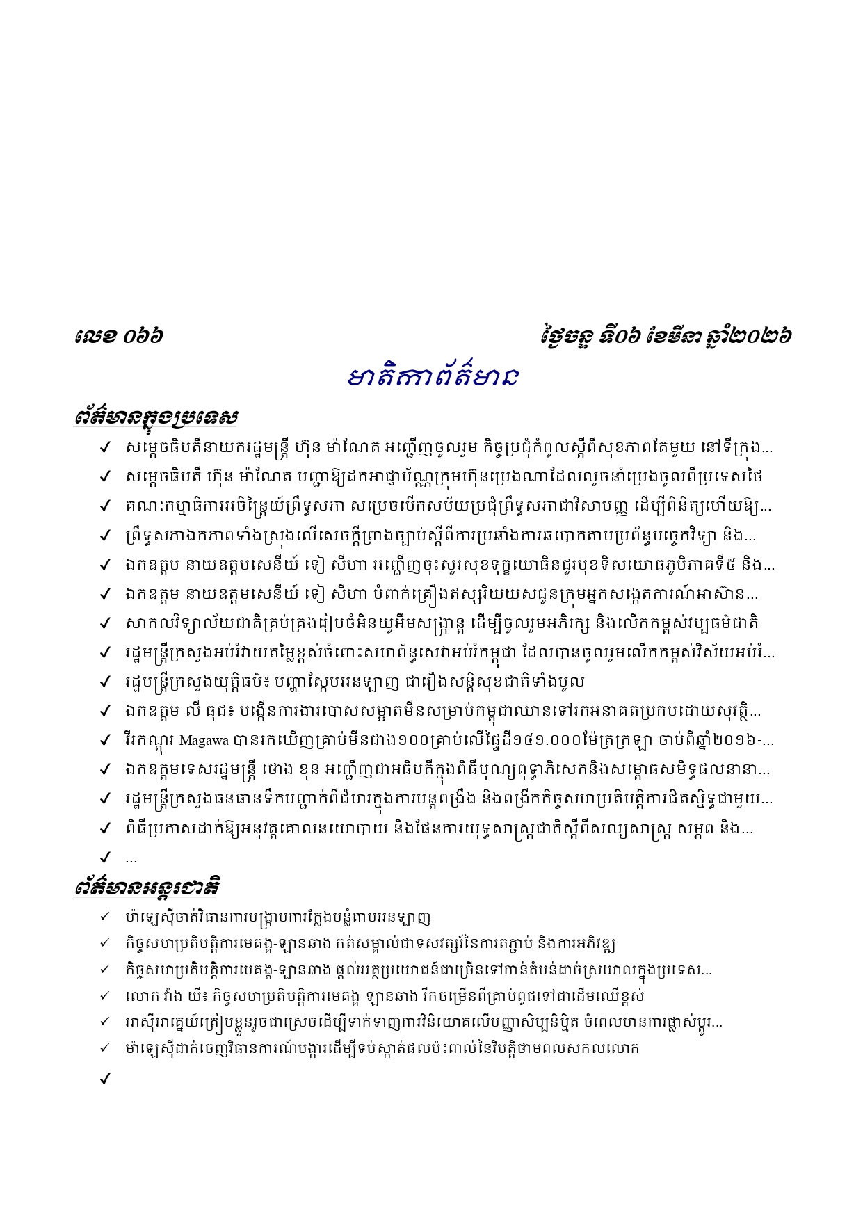 ព្រឹត្តិប័ត្រព័ត៌មានចេញផ្សាយសម្រាប់ថ្ងៃចន្ទ ទី០៦ ខែមេសា ឆ្នាំ២០២៦