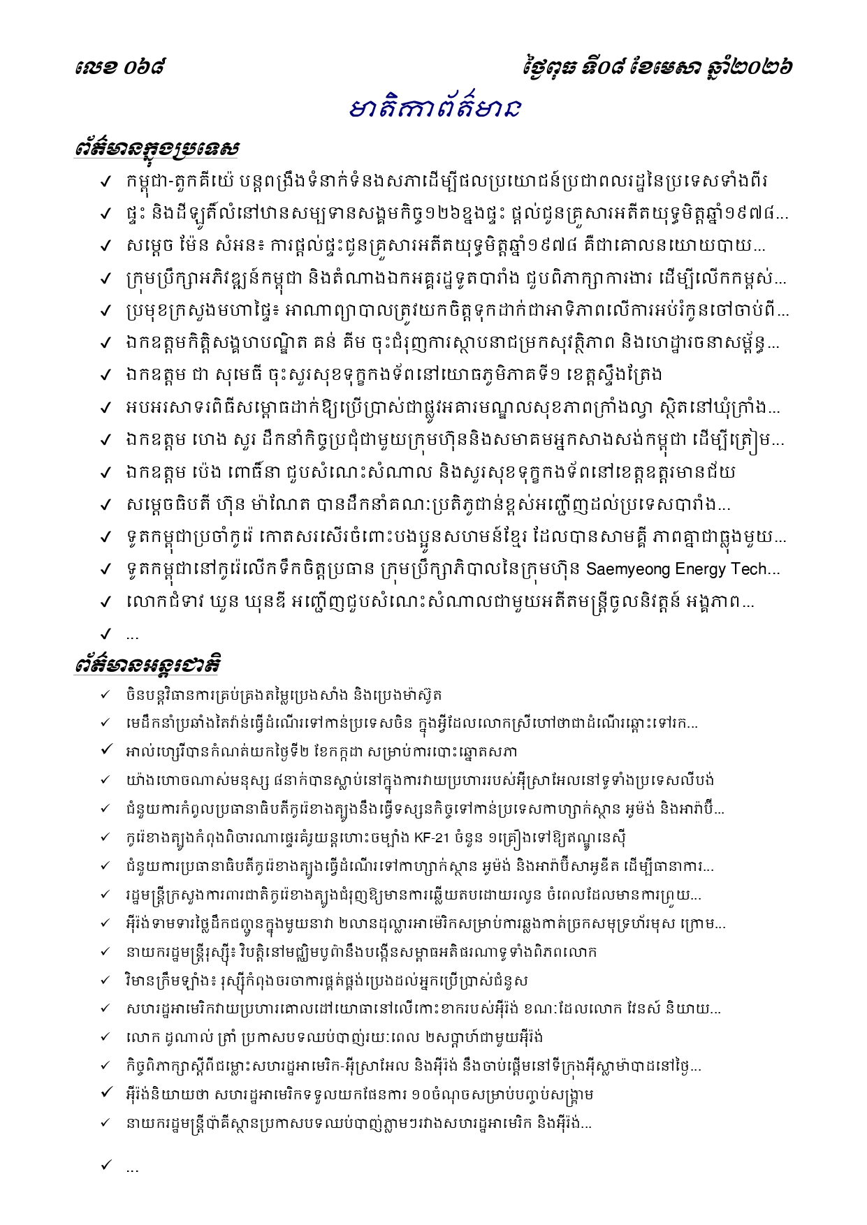 ព្រឹត្តិប័ត្រព័ត៌មានចេញផ្សាយសម្រាប់ថ្ងៃពុធ ទី០៨ ខែមេសា ឆ្នាំ២០២៦