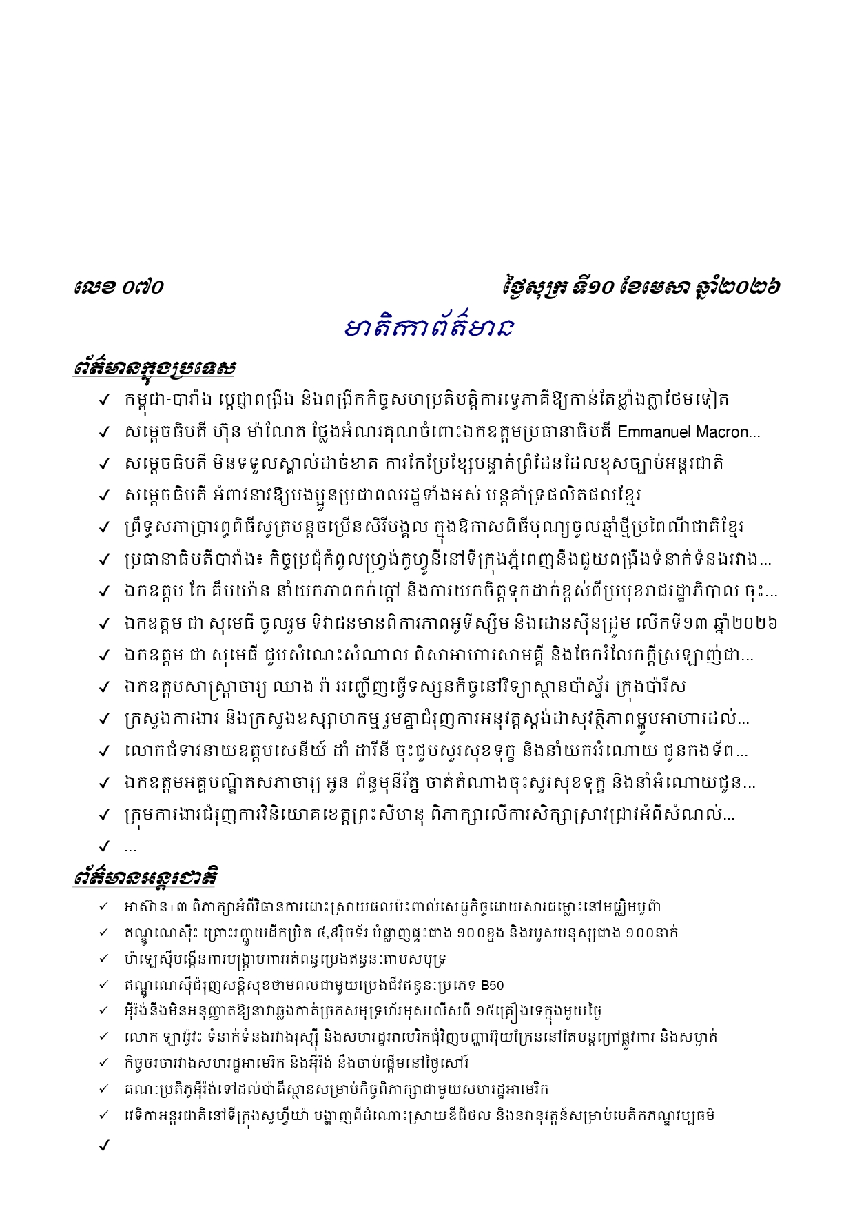 ព្រឹត្តិប័ត្រព័ត៌មានចេញផ្សាយសម្រាប់ថ្ងៃសុក្រ ទី១០ ខែមេសា ឆ្នាំ២០២៦