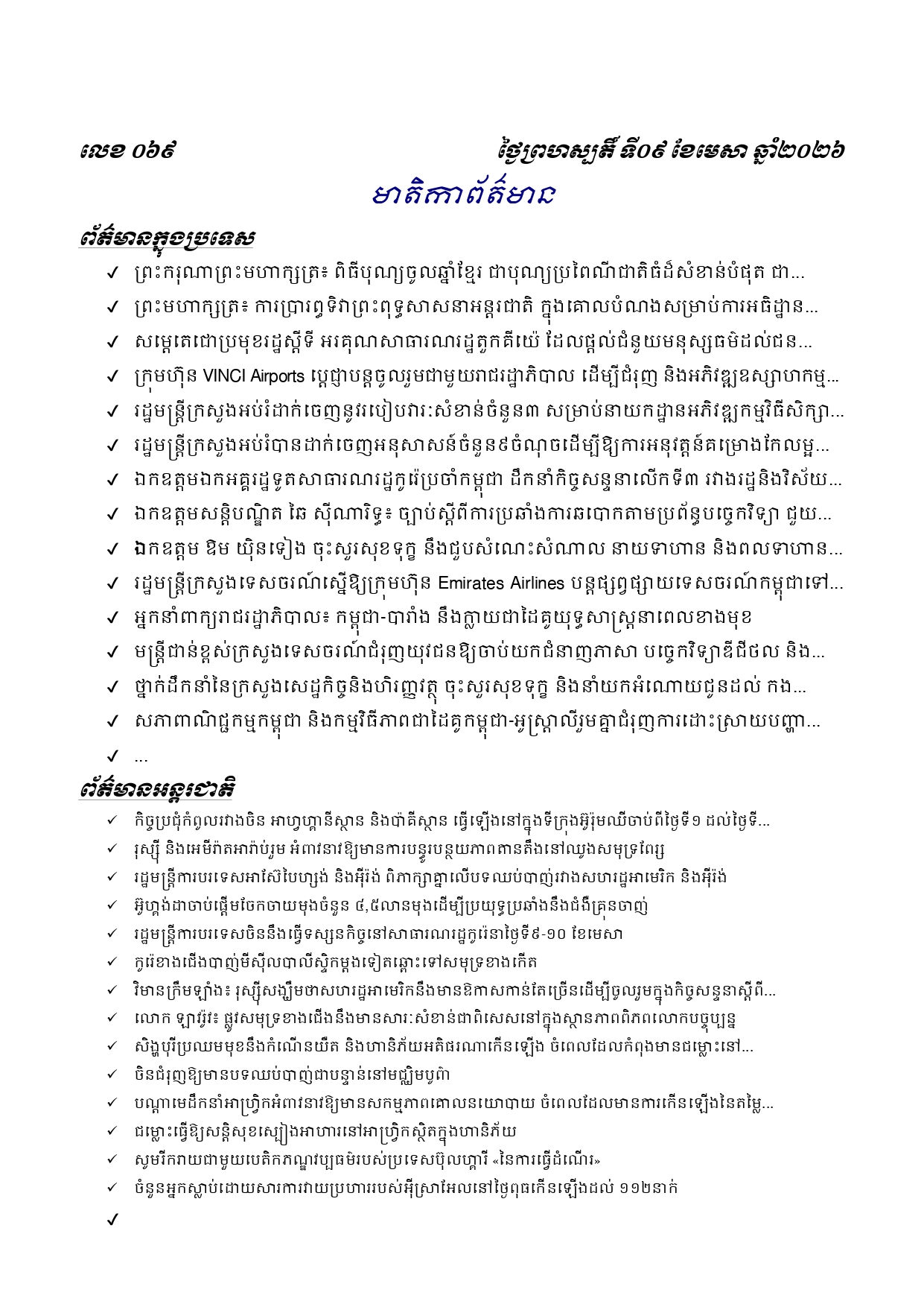 ព្រឹត្តិប័ត្រព័ត៌មានចេញផ្សាយសម្រាប់ថ្ងៃព្រហស្បតិ៍ ទី០៩ ខែមេសា ឆ្នាំ២០២៦