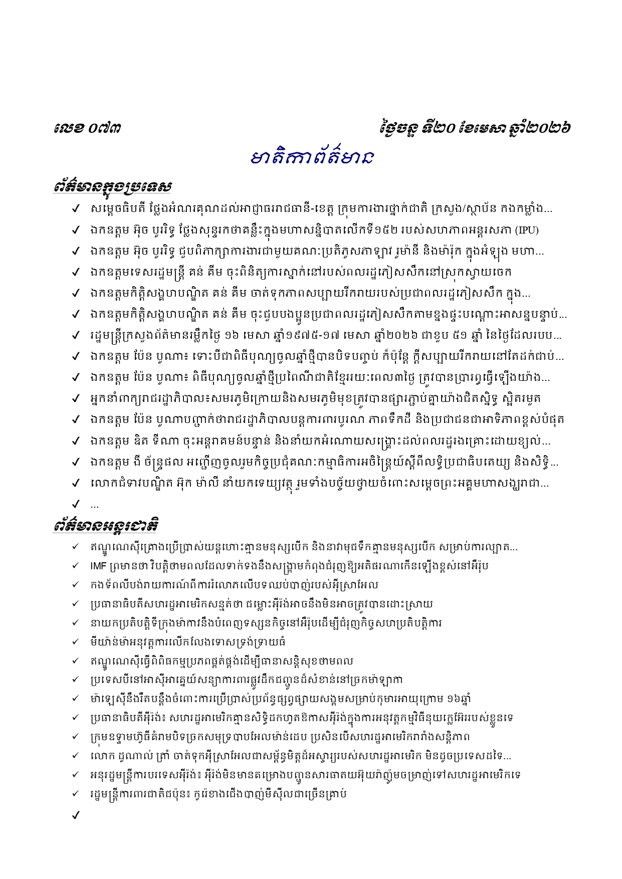 ព្រឹត្តិប័ត្រព័ត៌មានចេញផ្សាយសម្រាប់ថ្ងៃចន្ទ ទី២០ ខែមេសា ឆ្នាំ២០២៦