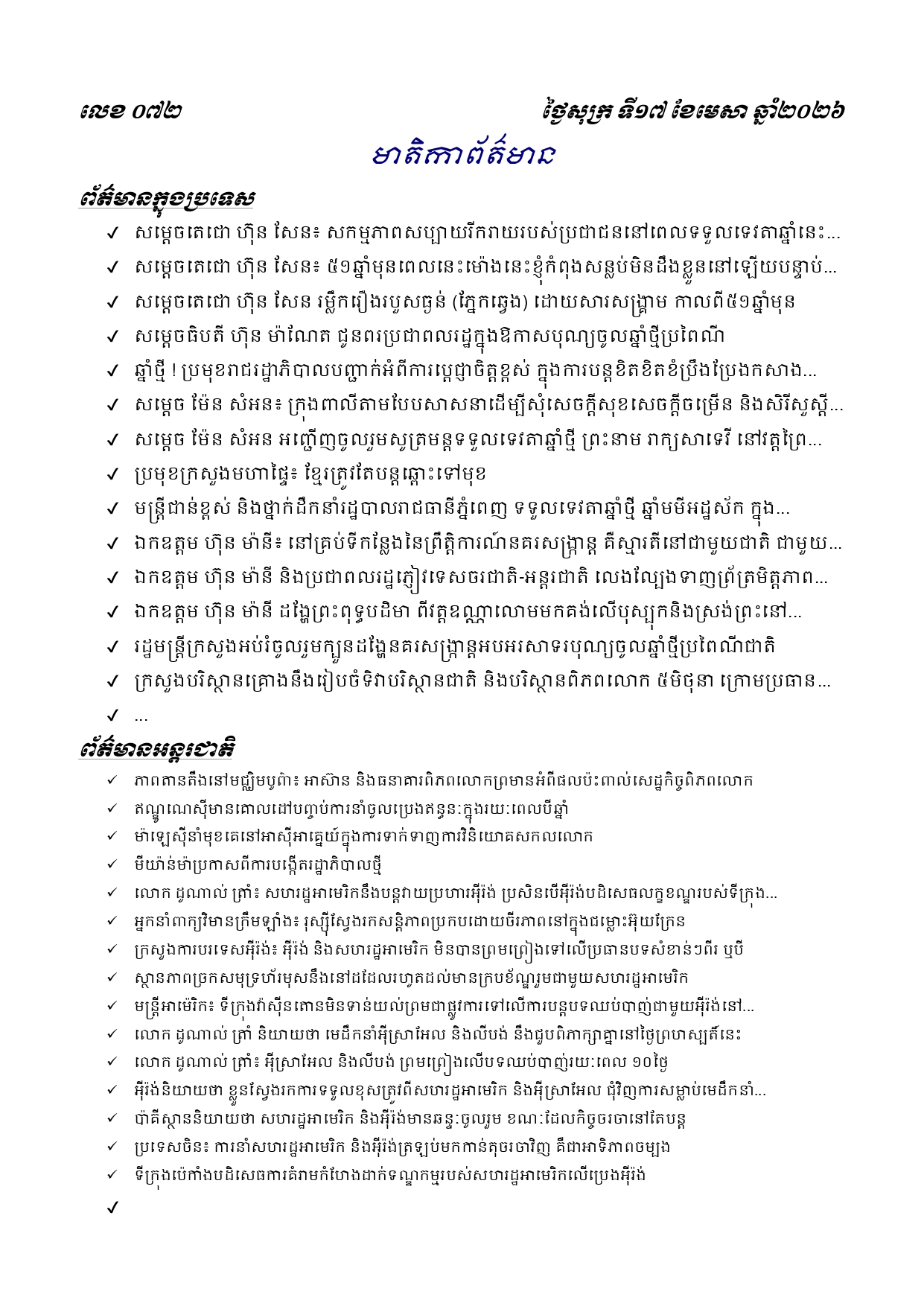 ព្រឹត្តិប័ត្រព័ត៌មានចេញផ្សាយសម្រាប់ថ្ងៃសុក្រ ទី១៧ ខែមេសា ឆ្នាំ២០២៦