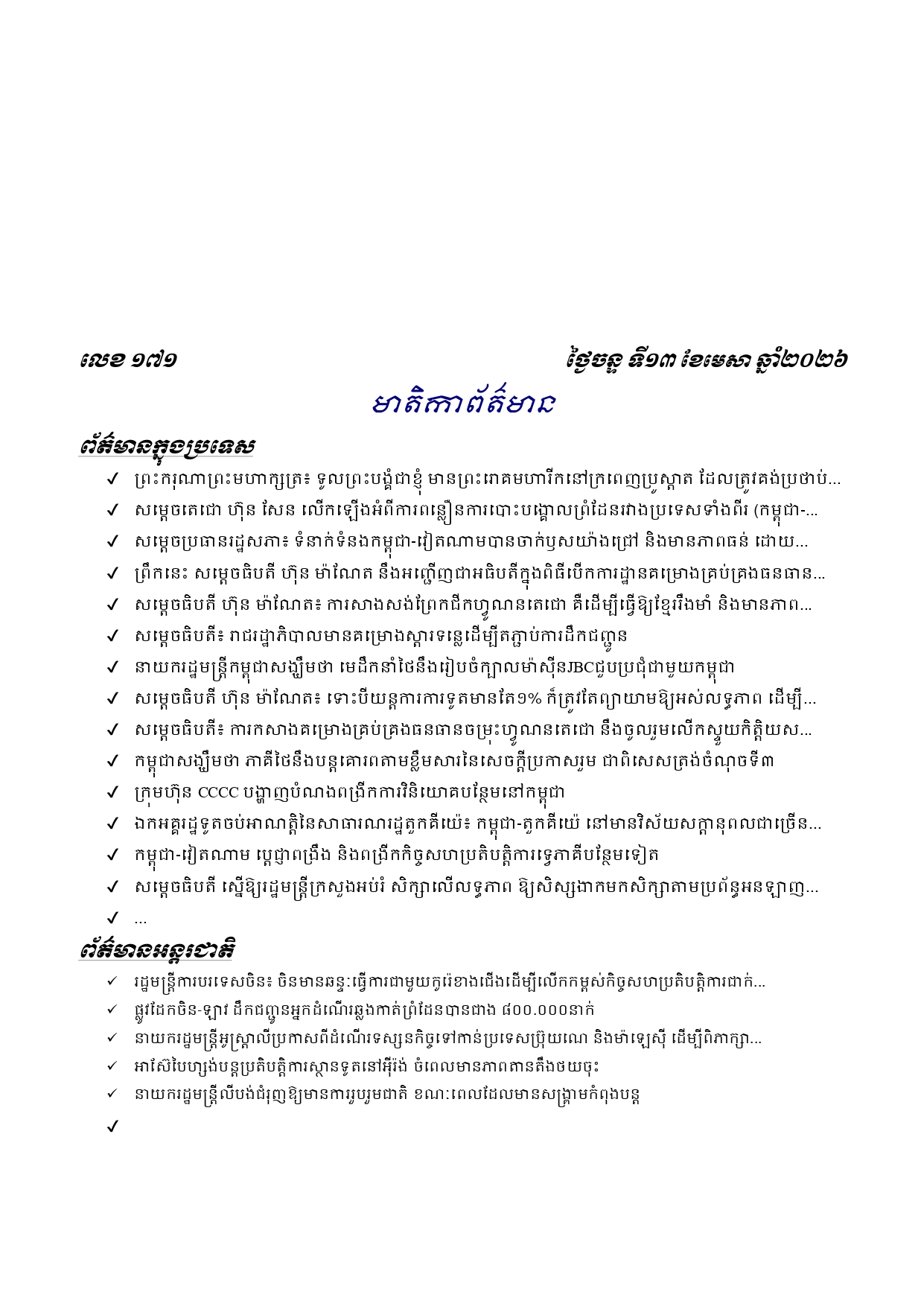 ព្រឹត្តិប័ត្រព័ត៌មានចេញផ្សាយសម្រាប់ថ្ងៃចន្ទ ទី១៣ ខែមេសា ឆ្នាំ២០២៦