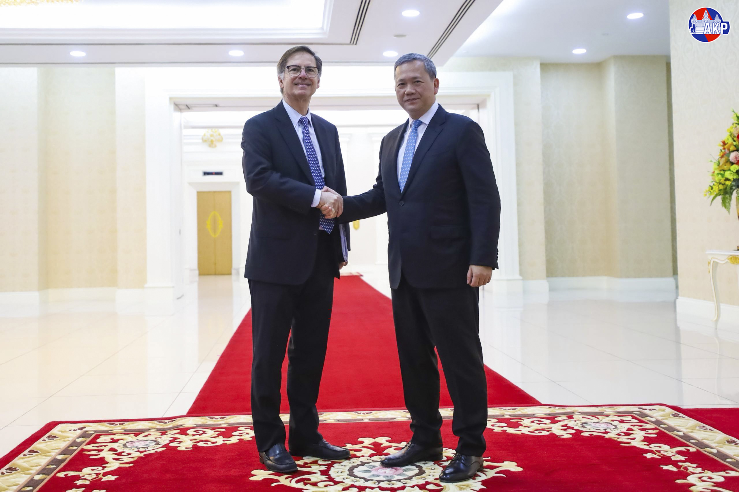 AKP Phnom Penh, March 17, 2026 -- Samdech Moha Borvor Thipadei Hun Manet (R, Pic. 1), Prime Minister of the Kingdom of Cambodia, greets visiting H.E. Mr. Carlos Felipe Jaramillo, Vice President of the World Bank for East Asia and the Pacific, prior to the courtesy meet...
