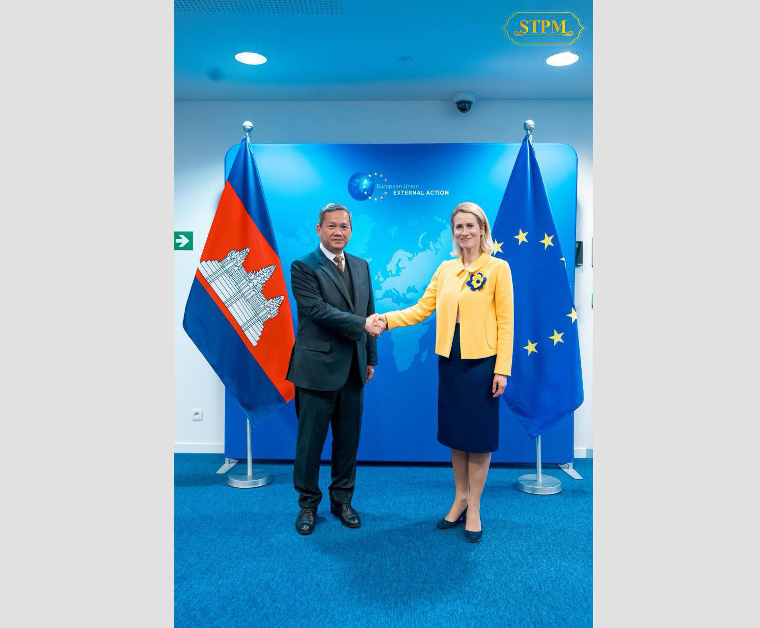 AKP Belgium, February 25, 2026— Cambodia’s Prime Minister Samdech Moha Borvor Thipadei Hun Manet (L) shakes hands with Ms. Kaja Kallas, Vice President of the European Commission, prior to their meeting in Belgium on the afternoon of Feb. 24 (Belgian time). Photo: Facebook Page of Samdech T...