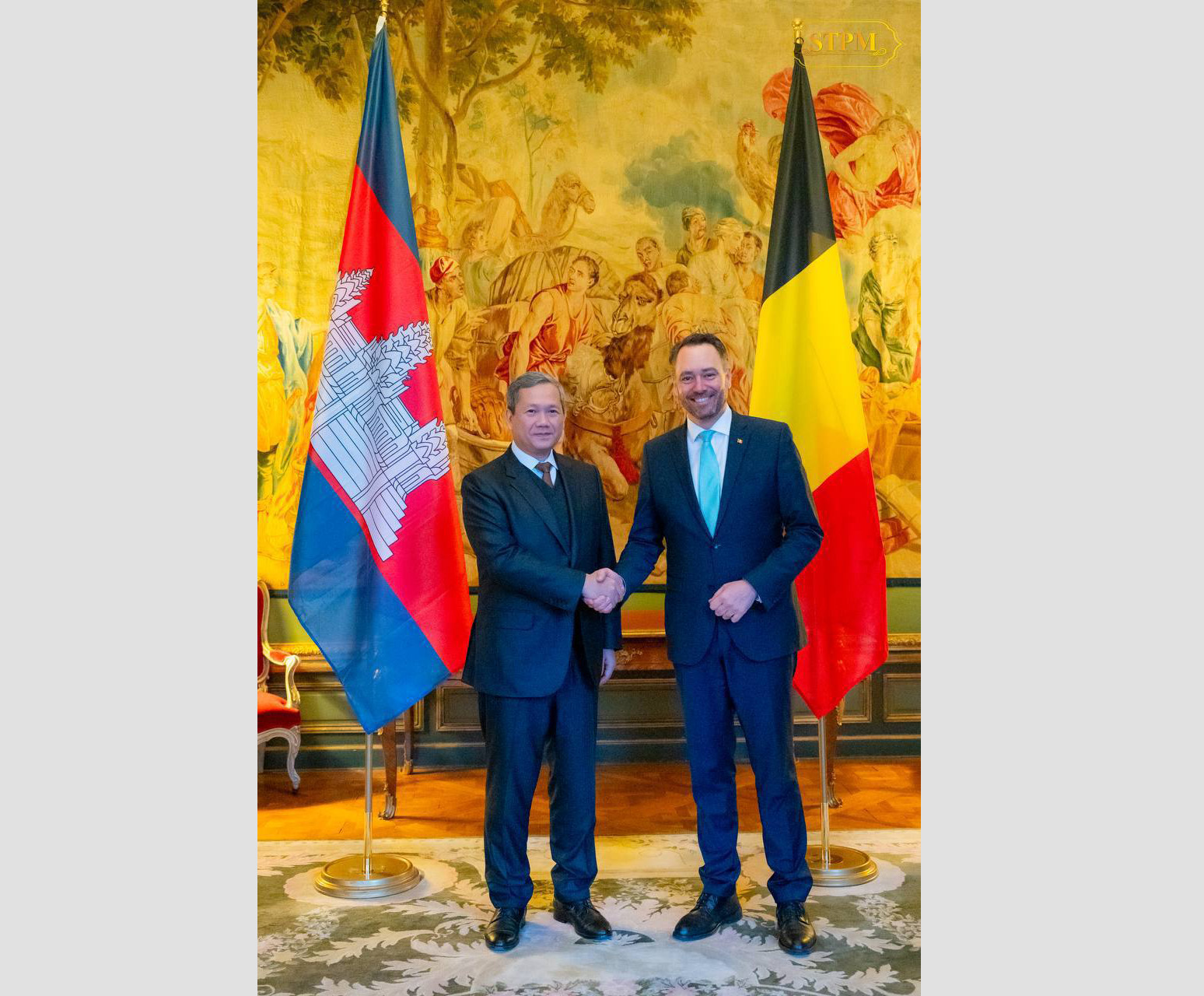 AKP Belgium, February 25, 2026— Prime Minister Samdech Moha Borvor Thipadei Hun Manet (L) of the Kingdom of Cambodia, poses for a photo with H.E. Maxime Prévot, Deputy Prime Minister and Minister of Foreign Affairs of Belgium, prior to their courtesy meeting in Belgium on the afternoon of Feb...