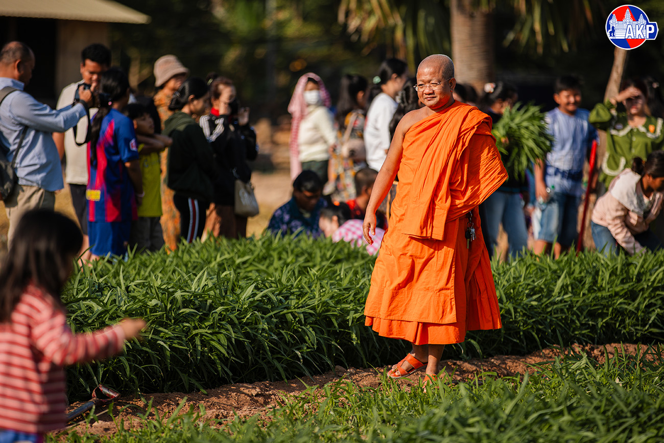 AKP Siem Reap, February 20, 2026 — Buddhist monks and followers, and displaced people are seen harvesting safe and organic vegetables grown at Kok Chork pagoda, located in Sangkat Kok Chork, Siem Reap provincial city, to be distributed to displaced pe...