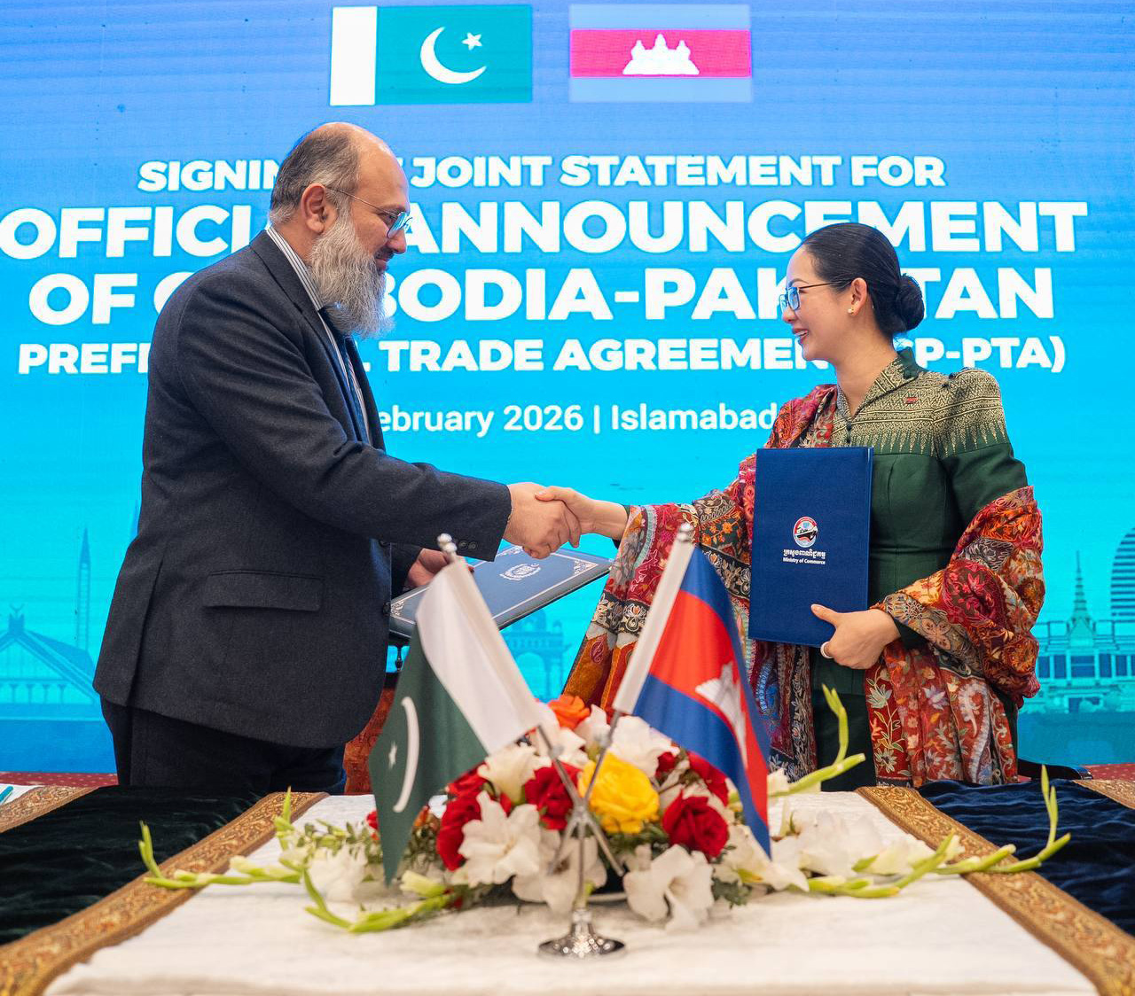 AKP Islamabad, February 11, 2026-- H.E. Mrs. Cham Nimul (Pic. 1), Minister of Commerce of the Kingdom of Cambodia, and H.E. Jam Kamal Khan (Pic. 2), Federal Minister of Commerce of the Islamic Republic of Pakistan, co-chair the 2nd Pakistan-Cambodia Joint Trade Com...
