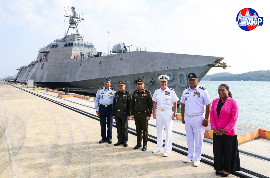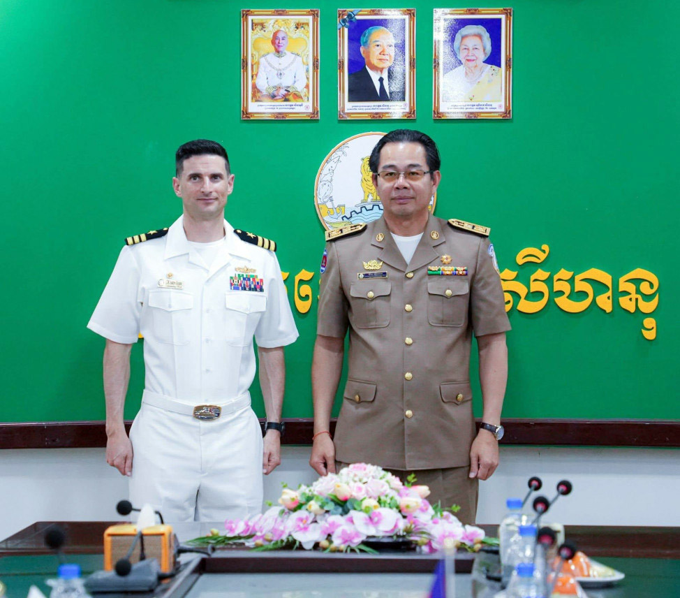 AKP Sihanoukville, January 26, 2026— H.E. Mang Sineth (R, Pic. 1), Preah Sihanouk Provincial Governor, poses for a photo with Lieutenant Commander Andrew J. Recame, Commander of the United States Navy warship USS Cincinnati (LCS 20), prior to their courtesy meeting...