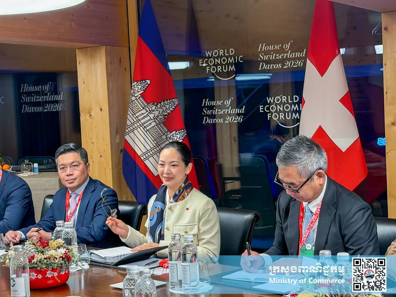 AKP Phnom Penh, January 20, 2026 -- Cambodia's Minister of Commerce H.E. Mrs. Cham Nimul (C, Pic. 1) holds talks with H.E. Ms. Helene Budliger Artieda (C, Pic. 2), State Secretary of Economic Affairs of the Swiss Confederation, in Davos-Klosters, Switzerland on Jan. 20. Photo : Min...