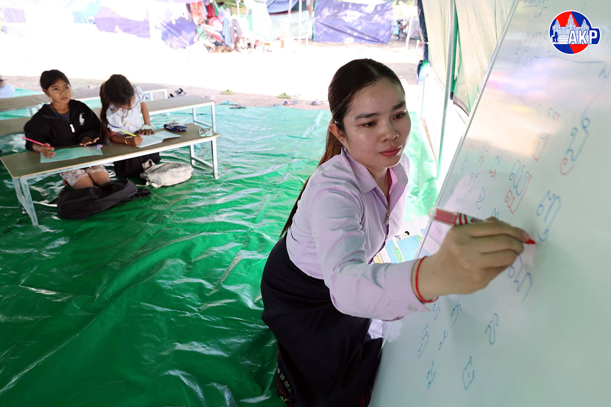 AKP Banteay Meanchey, January 05, 2026— Displaced children from Chouk Chey and Prey Chan villages, O’Beichoan commune, O’Chrov district, Banteay Meanchey province, attend temporary classes at Wat Chan Sy Samaki Ratanaram Safety Centre located in Kop commune...