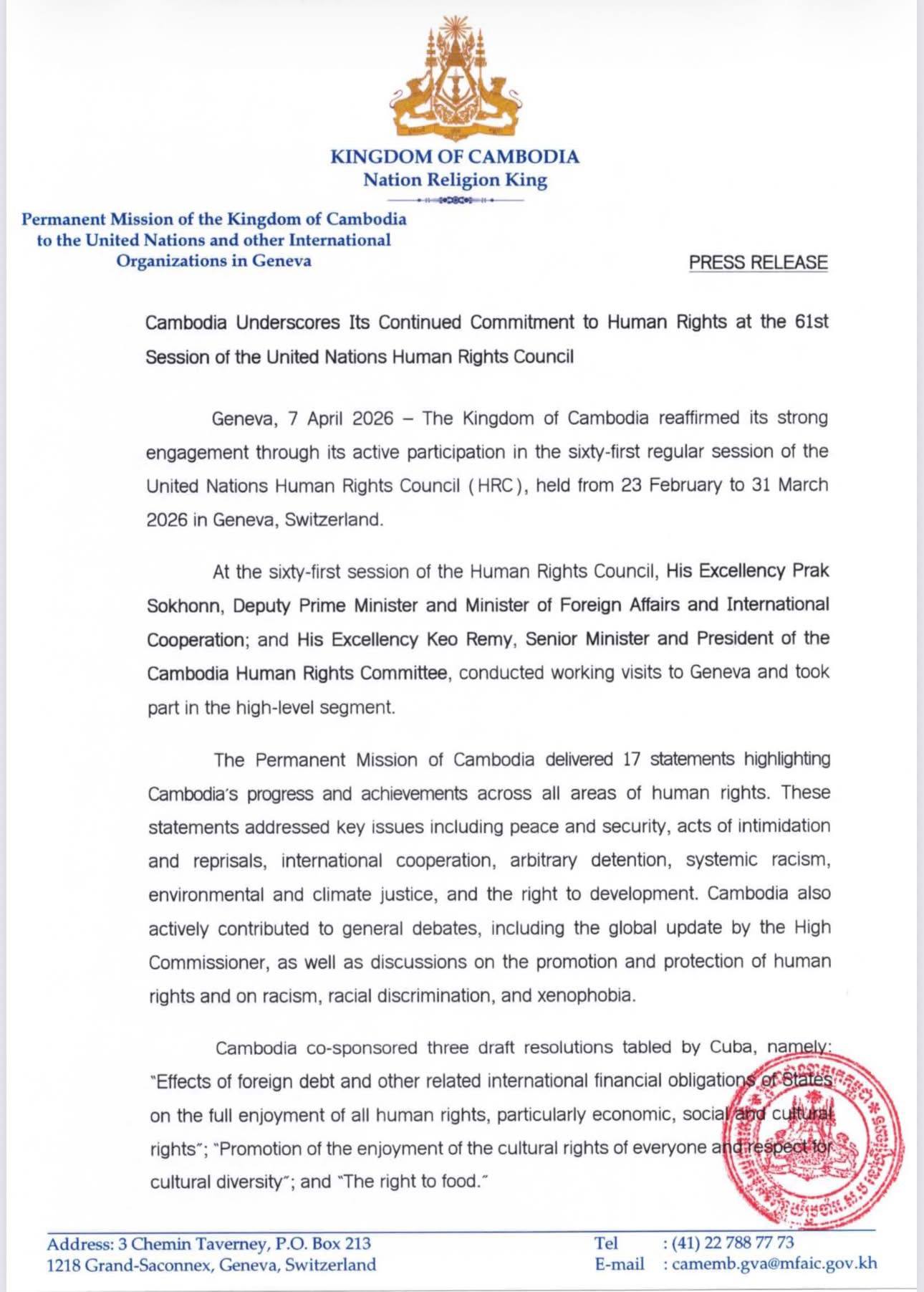 Permanent Mission: Cambodia Underscores Its Continued Commitment to Human Rights