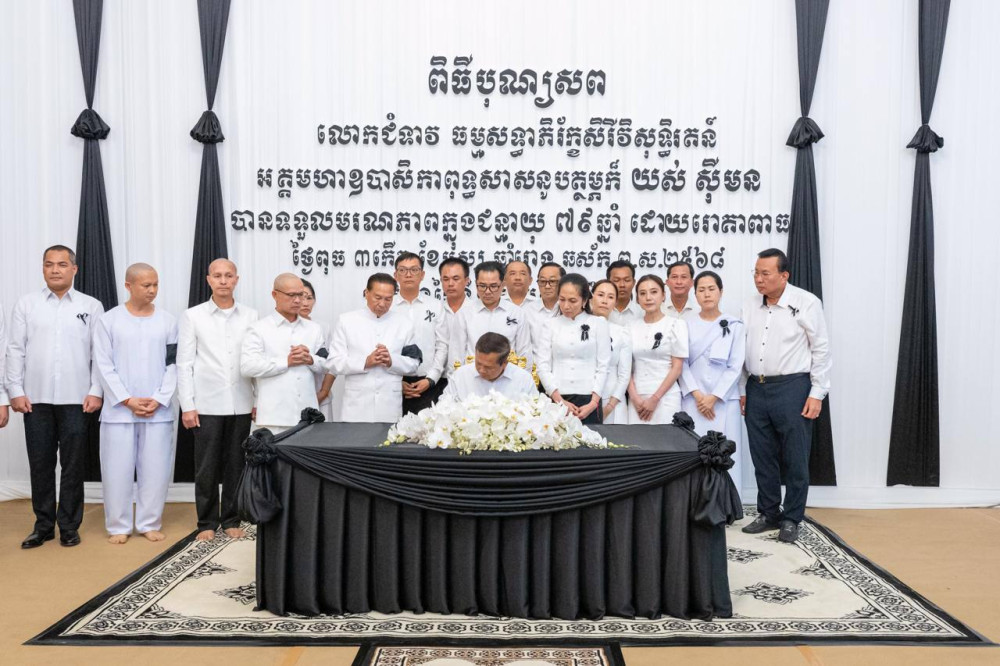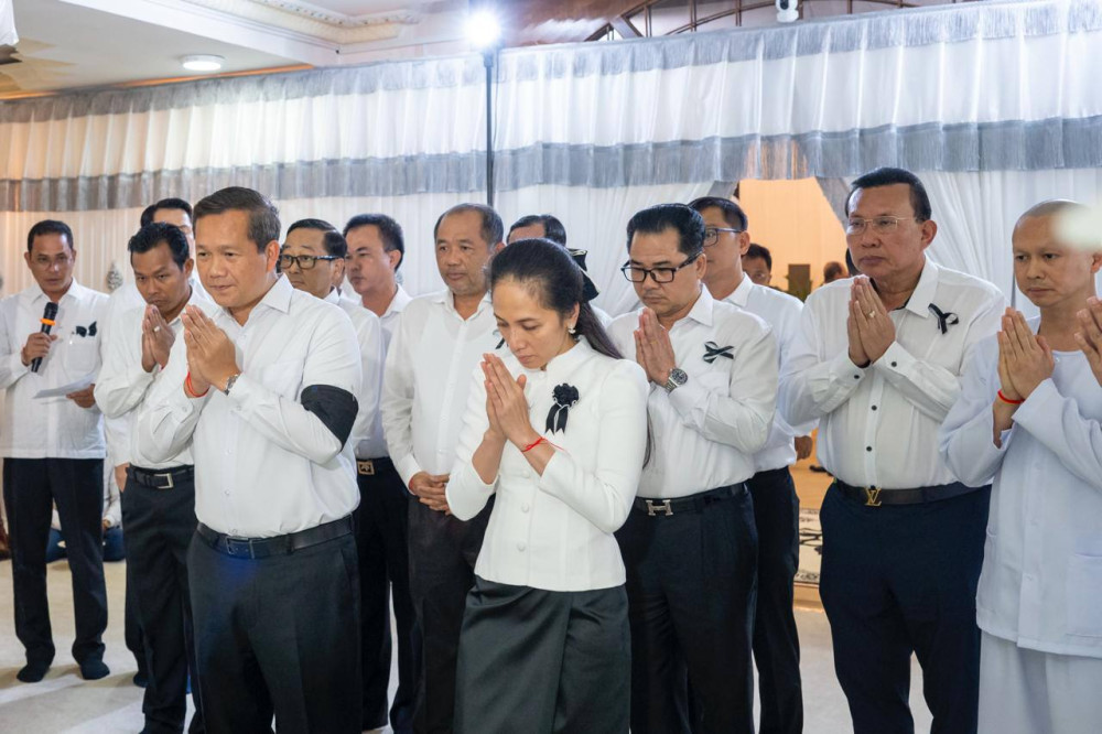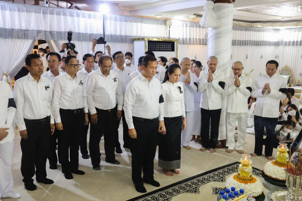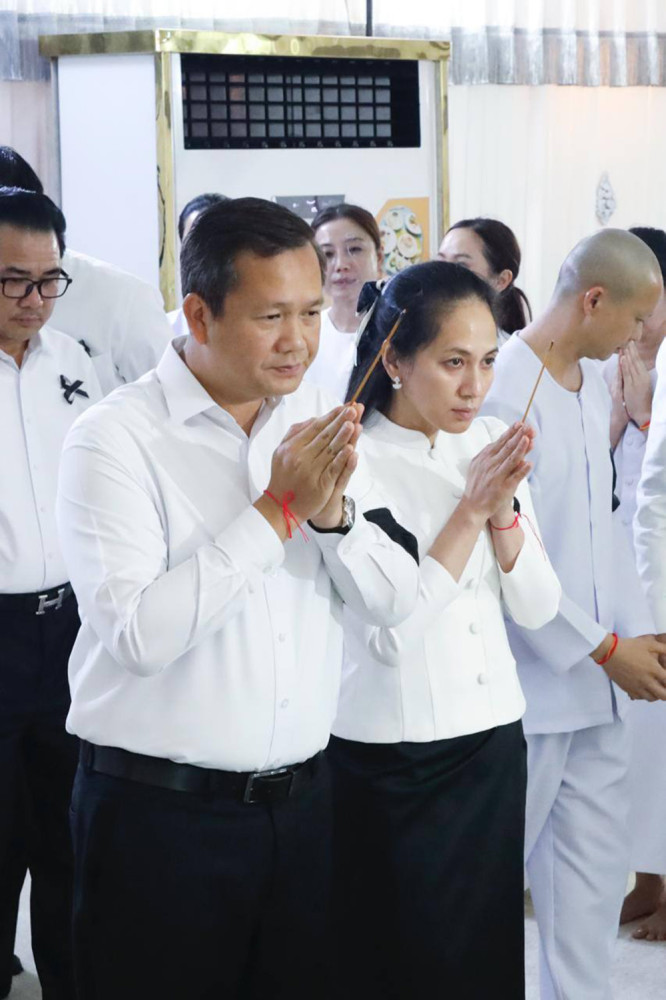 Prime Minister Samdech Moha Borvor Thipadei Hun Manet and First Lady Lok Chumteav Dr. Pich Chanmony pay tribute to late Lok Chumteav Yos Simorn, spouse of H.E. Gen. Moeung Samphan, Secretary of State at the Ministry of National Defence, in Phnom Penh this afternoon.