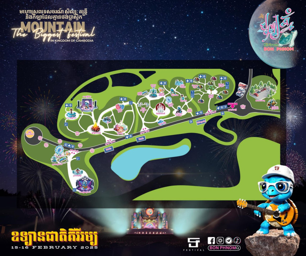 According to its online source, the Tourism, Music Arts, and Sports Festival without Plastic, "BON PHNOM" will bring various excited programmes, sport challenges, and Khmer foods along with festive decorations along 4 kilometres of main road on top of Kirirom National Park, from Neak Poan Roundabout to Former Palace, from 8:00 am – 2:00 am.