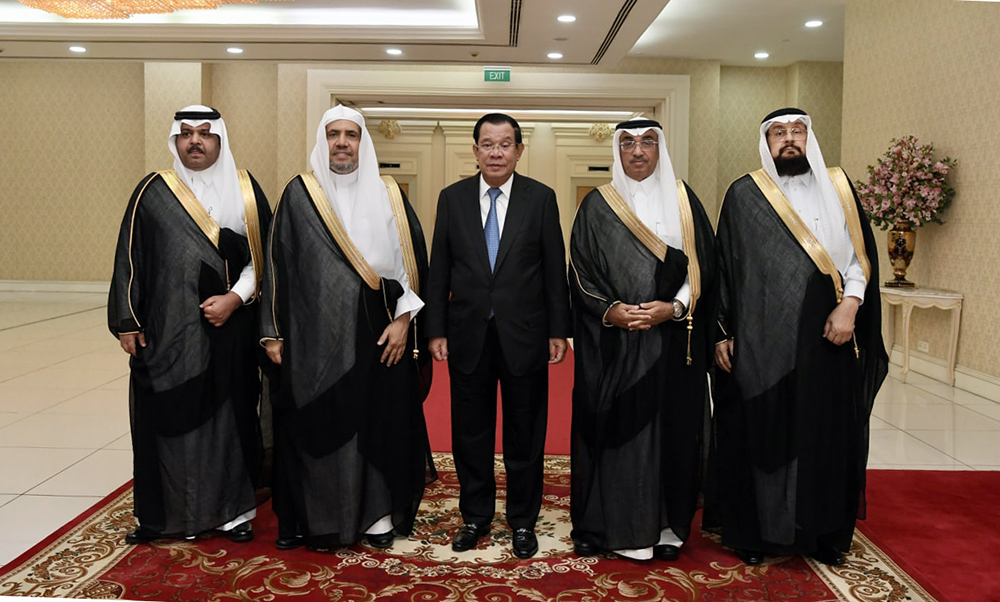 Samdech Techo Hun Sen (C), former Prime Minister of Cambodia, poses for a group photo with a delegation of Muslim World League led by its Secretary General Muhammad Bin Abdulkarim Al-Issa (2nd L)