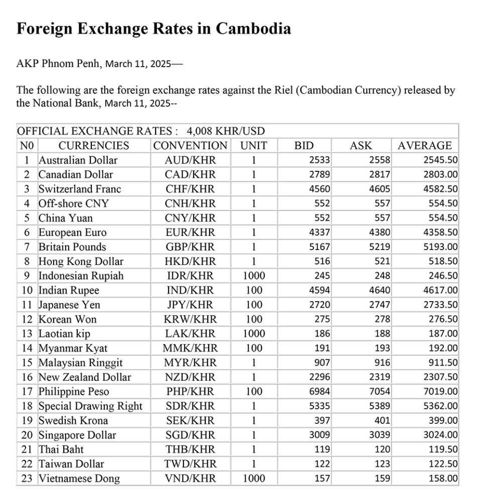 The following are the foreign exchange rates against the Riel (Cambodian Currency) released by the National Bank, March 11, 2025.