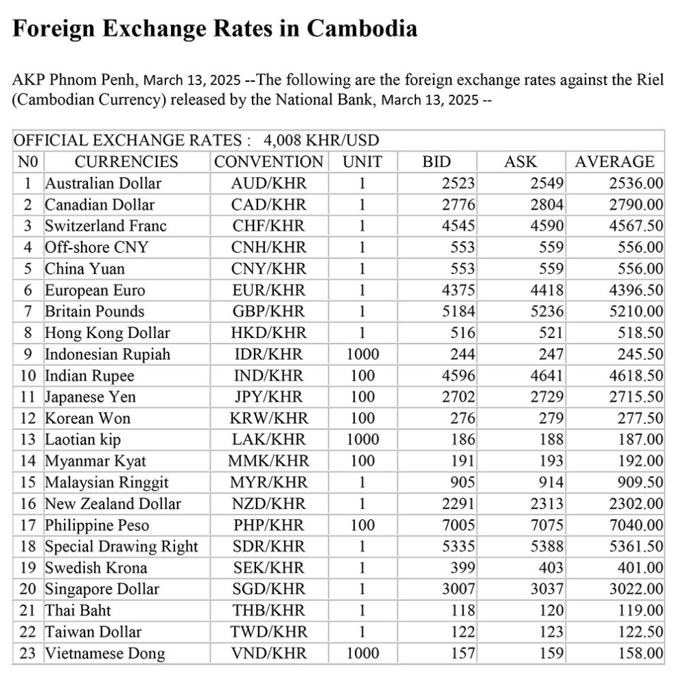 AKP Phnom Penh, March 13, 2025 --The following are the foreign exchange rates against the Riel (Cambodian Currency) released by the National Bank, March 13, 2025 --