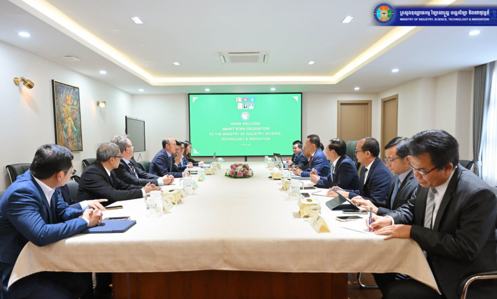 H.E. HEM Vanndy, Minister of Industry, Science, Technology & Innovation, received a delegation from Smart Eden, led by Neak Oknha Hun Lak and CEO Laurent Strauch, to discuss expanding the production and export of Cambodian products to the French market.