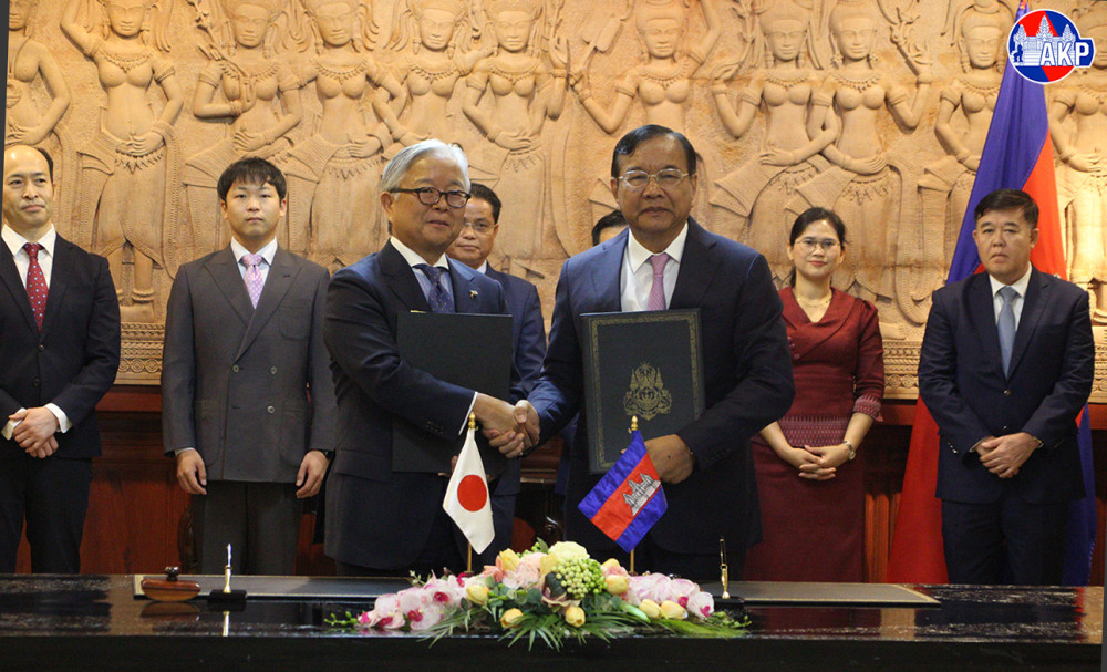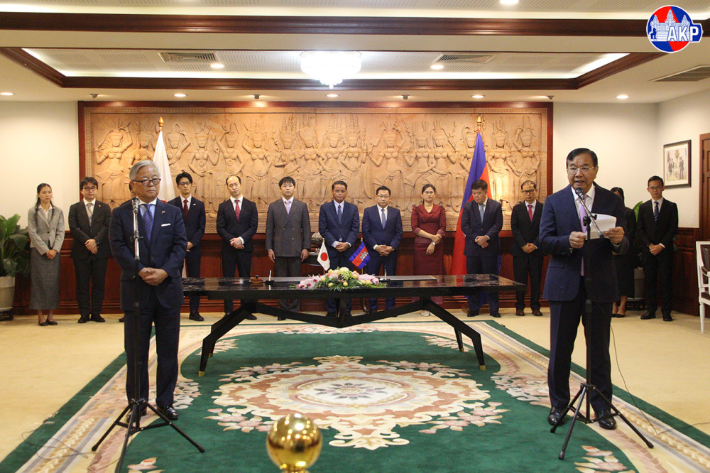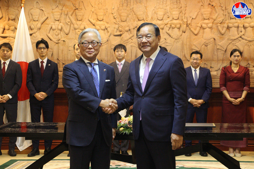 Deputy Prime Minister H.E. PRAK Sokhonn (R, Sitting, Pic. 1), Minister of Foreign Affairs and International Cooperation of Cambodia, and H.E. UENO Atsushi, Ambassador Extraordinary and Plenipotentiary of Japan to Cambodia, sign the Exchange of Notes and documents on the Japanese Government’s grant, held at the Ministry in Phnom Penh this morning.
