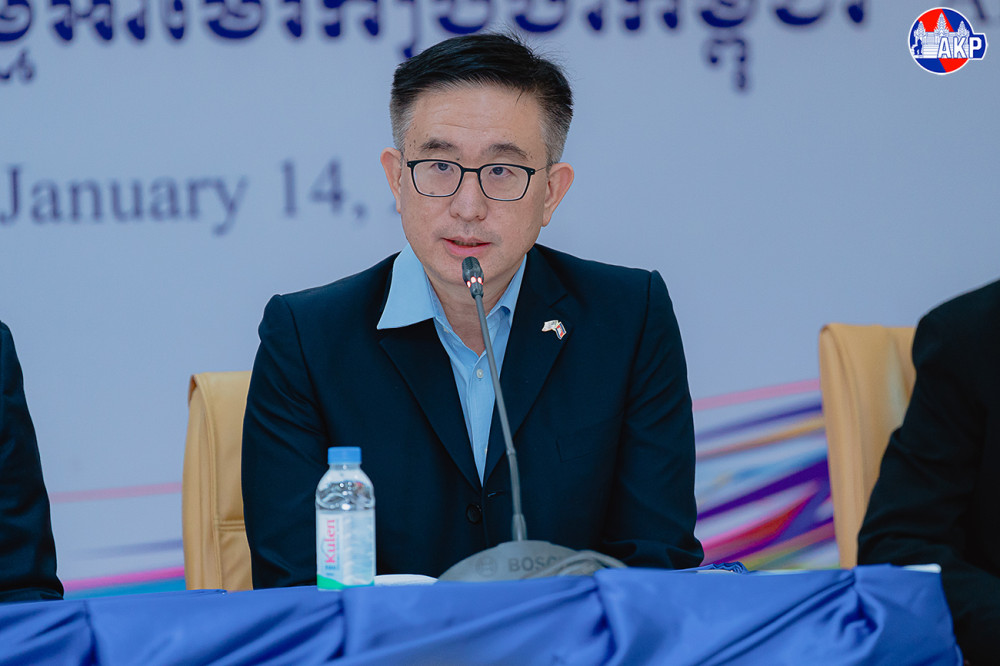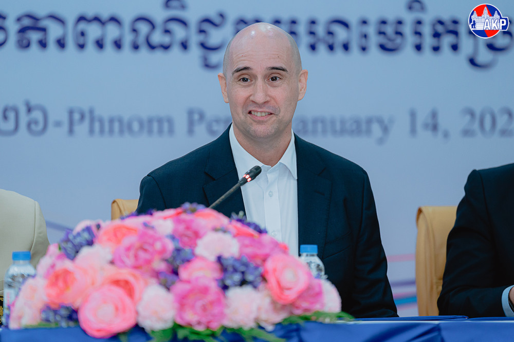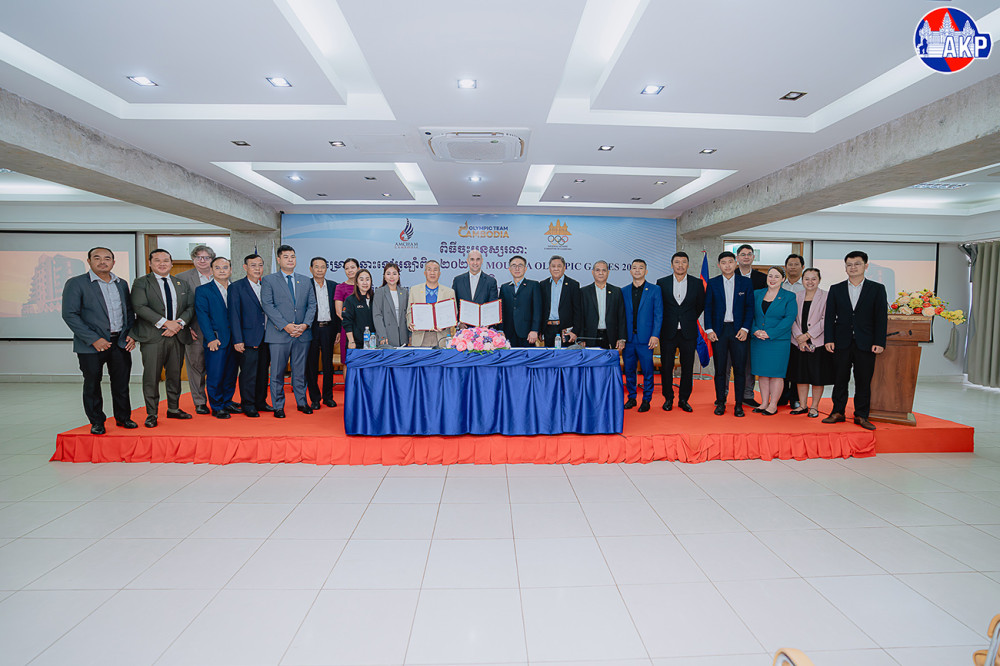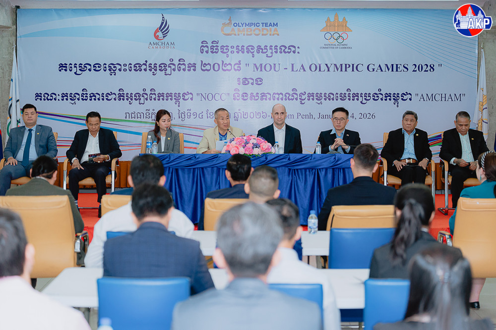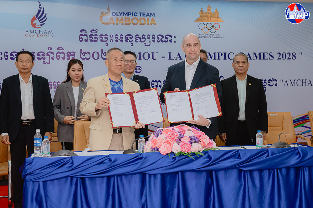H.E. Vath Chamroeun (L Sitting, Pic. 1), Secretary General of the National Olympic Committee of Cambodia (NOCC), and Mr. Casey Barnett, President of the American Chamber of Commerce in Cambodia (AmCham), sign a memorandum of understanding (MoU) on the project towards the 2028 Olympics (LA Olympic Games 2028), at the NOCC headquarters in Phnom Penh this morning.