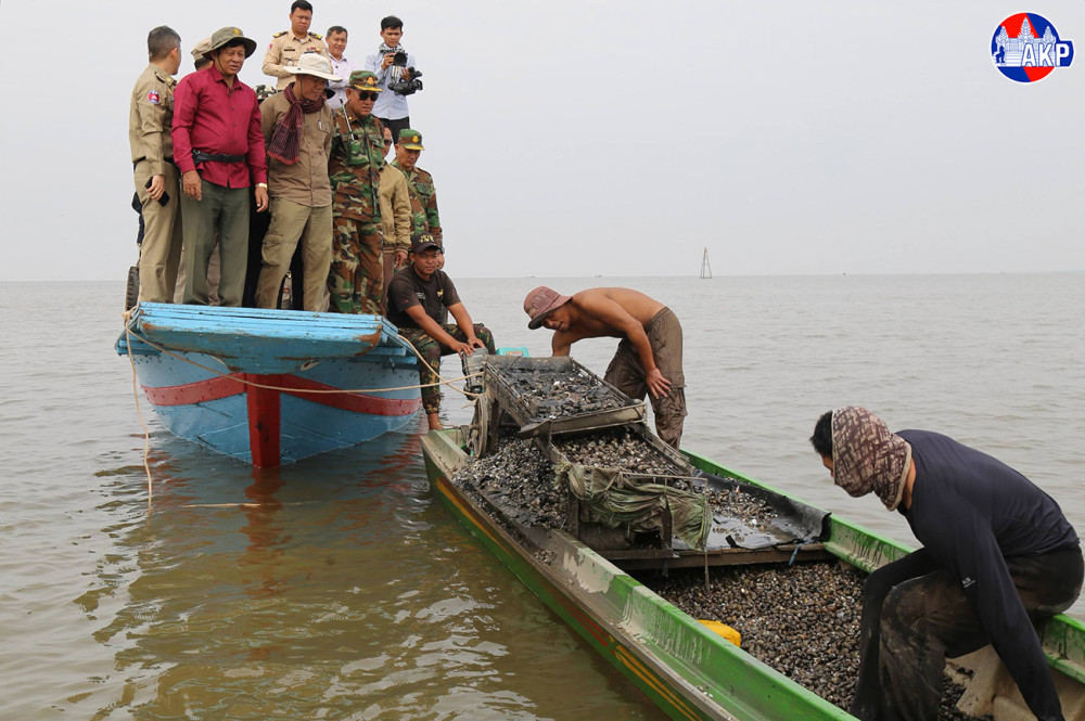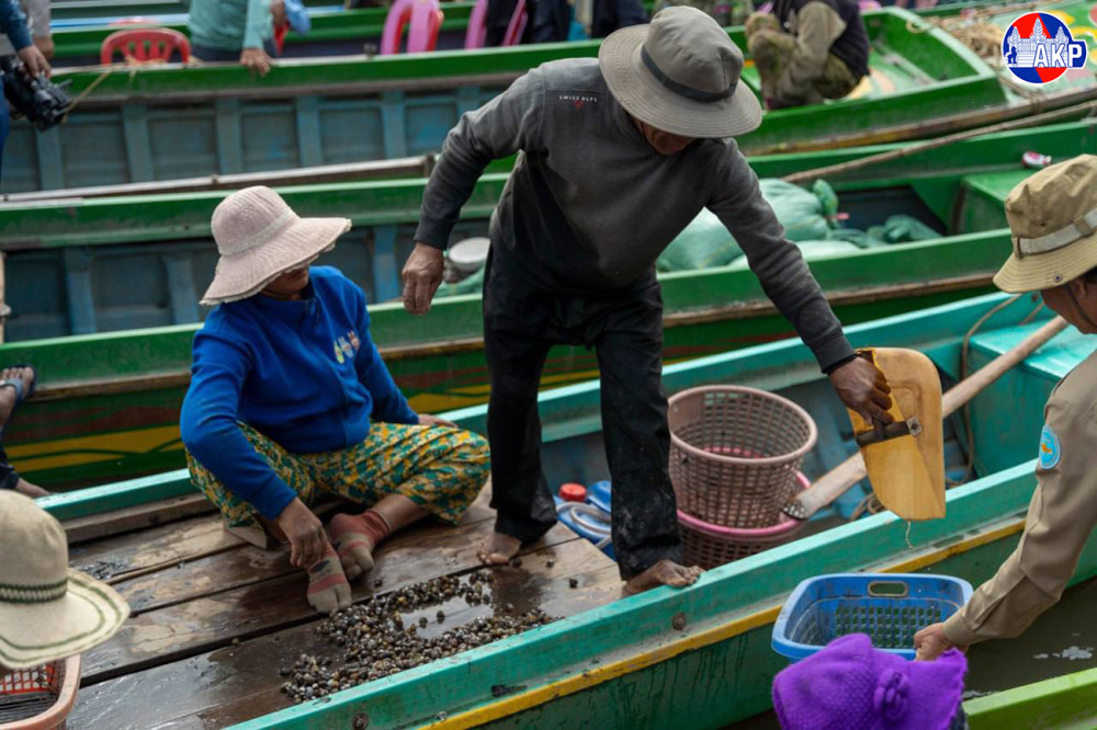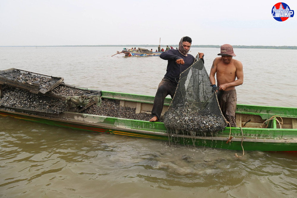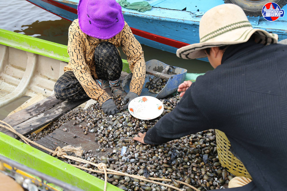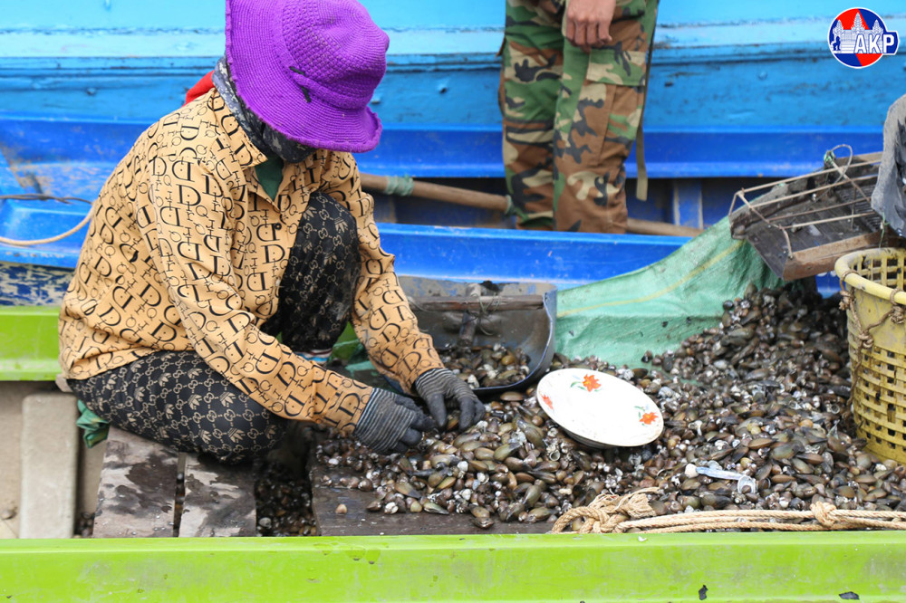 Local fishermen are engaging in clam harvesting activities using traditional clam-dragging gear in Kampong Khleang commune, Sotr Nikum district, Siem Reap province.