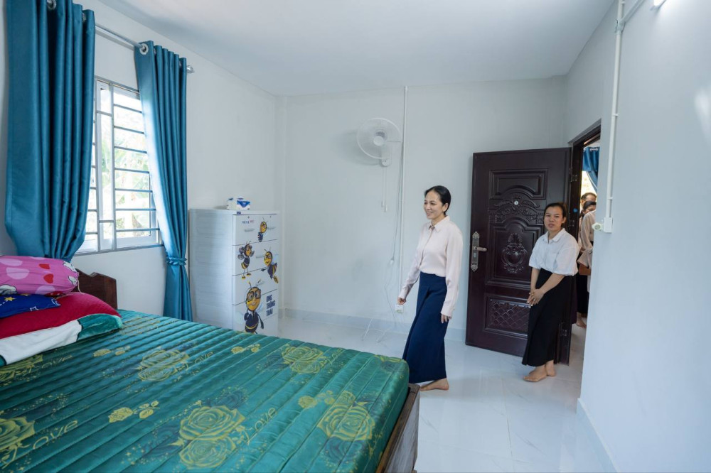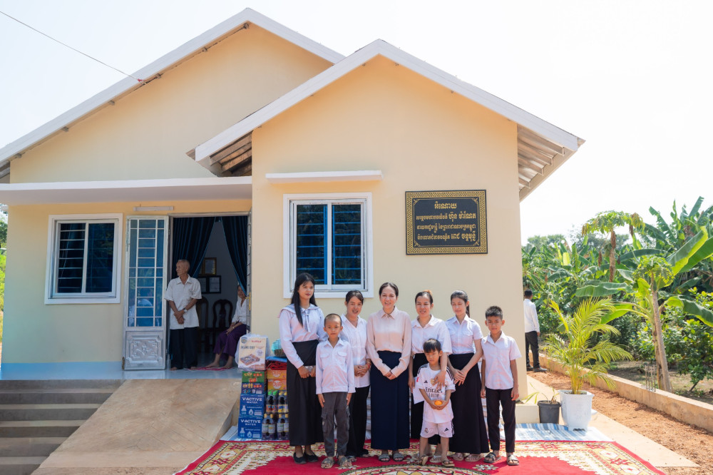 First Lady Lok Chumteav Dr. Pich Chanmony Hun Manet (4th L, Pic. 1) poses for a photo with the family of a fallen soldier during her mission to Thbong Khmum and Kampong Cham provinces this afternoon to hand over four new houses to families of fallen soldiers.
