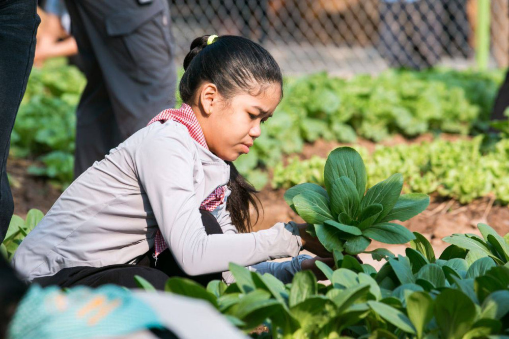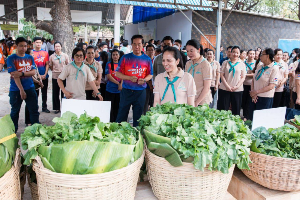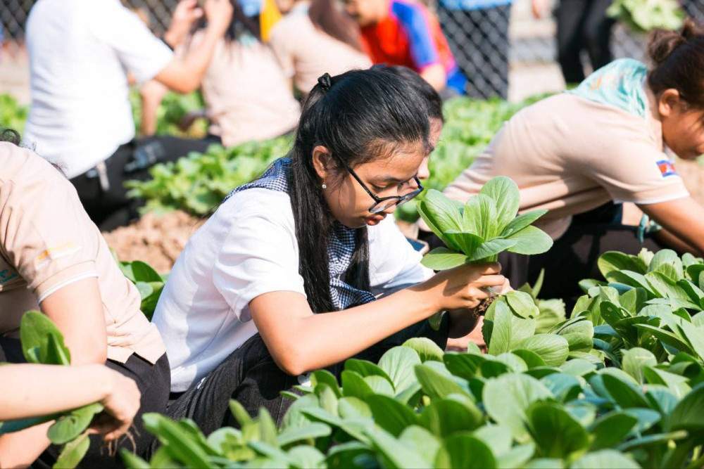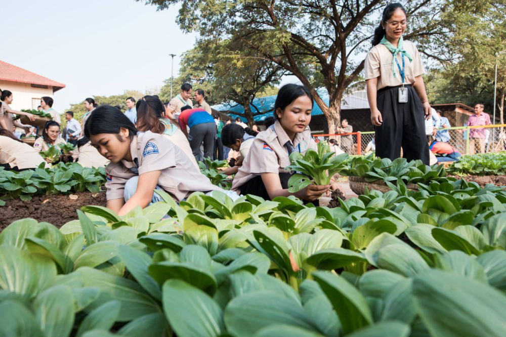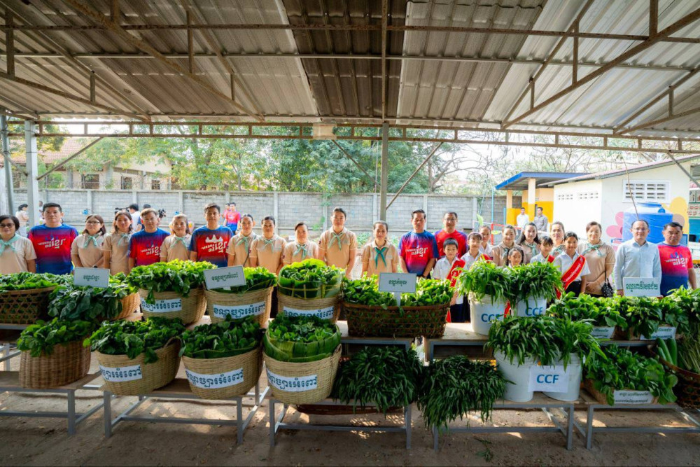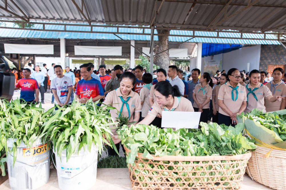 First Lady Lok Chumteav Dr. Pich Chanmony Hun Manet (Sitting, Pic. 1), takes part in harvesting agricultural produce grown under the “Together for the Nation” movement at Phnom Penh Thmey Primary School in Khan Sen Sok, Phnom Penh this morning.