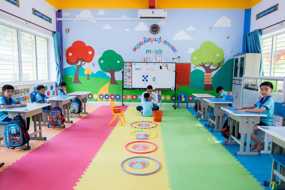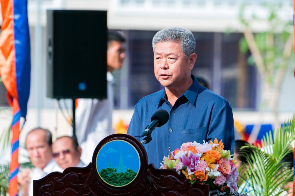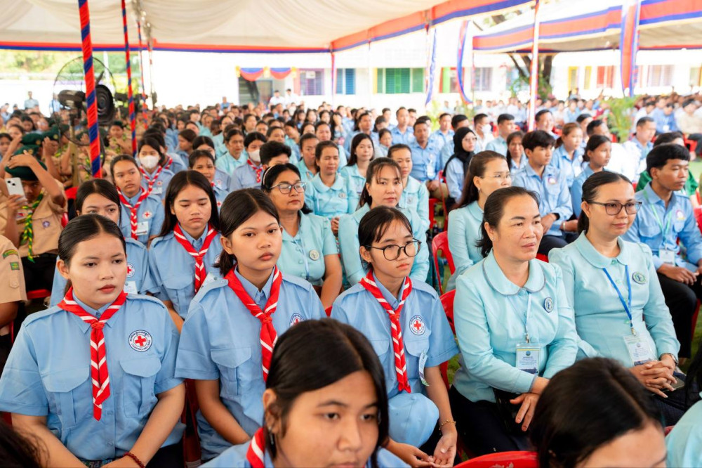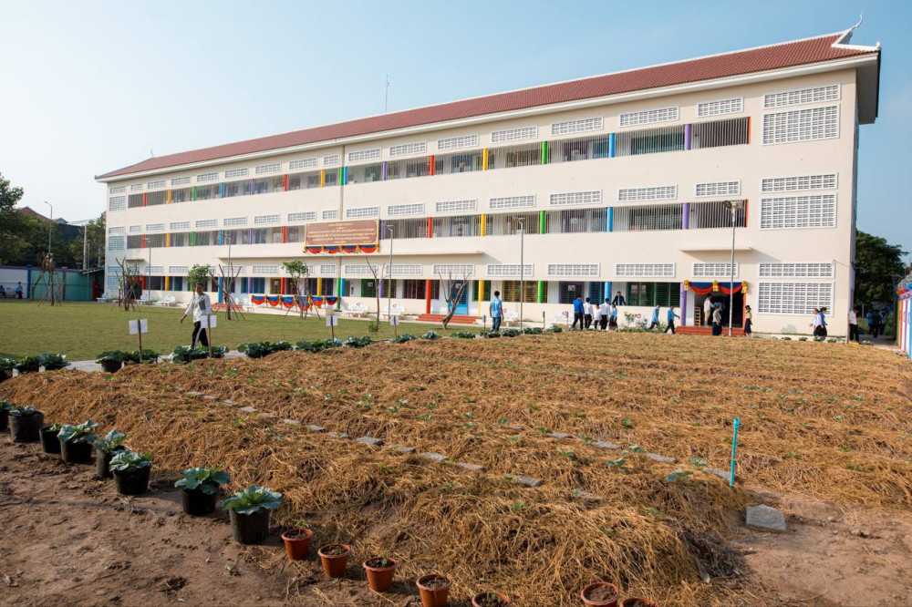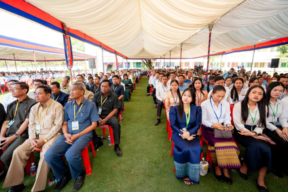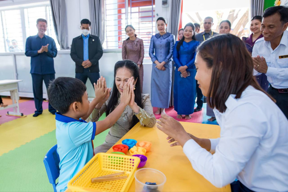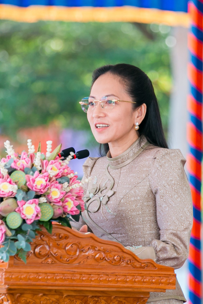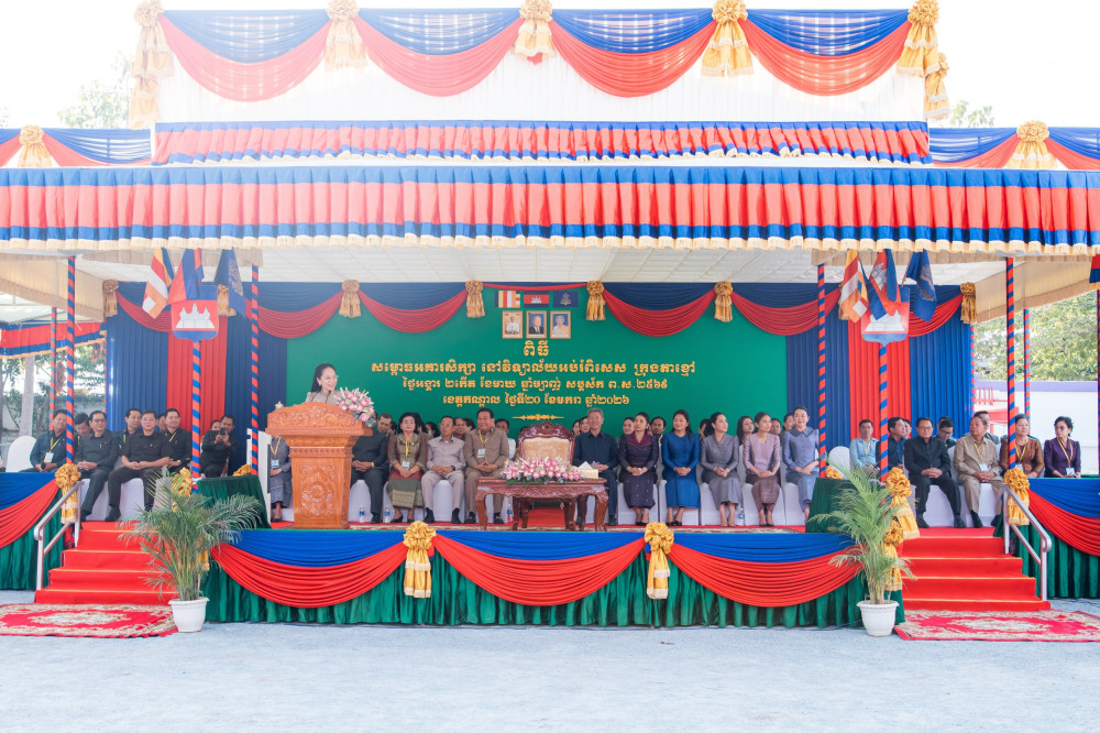 First Lady Lok Chumteav Dr. Pich Chanmony Hun Manet (Pic. 1) cuts red ribbon to inaugurate two 3-storey, 36-room school buildings at Takhmao Special Education High School in Kandal province this morning.