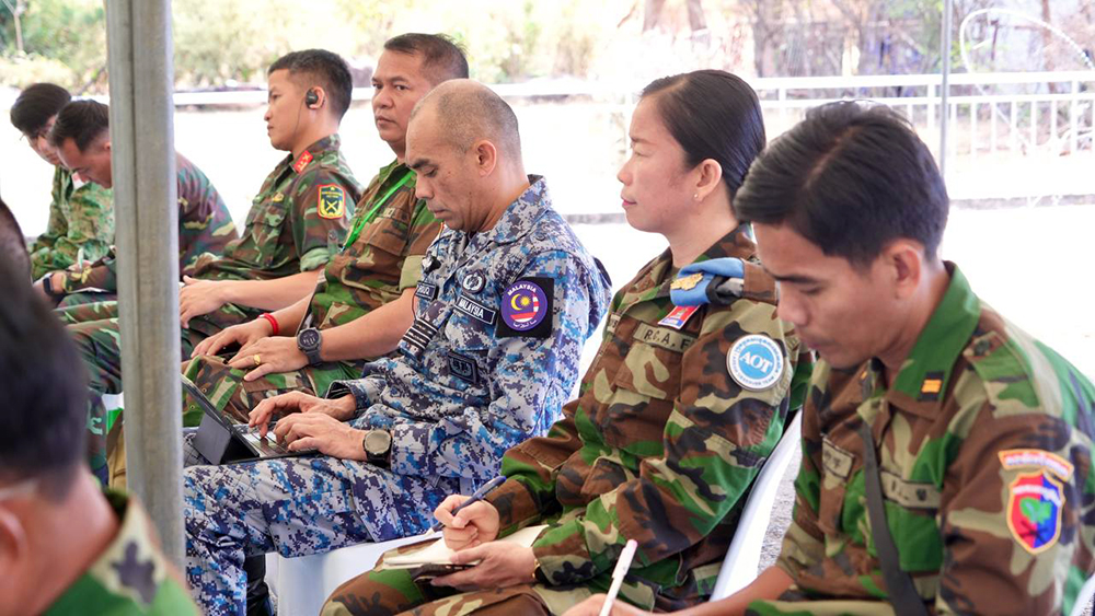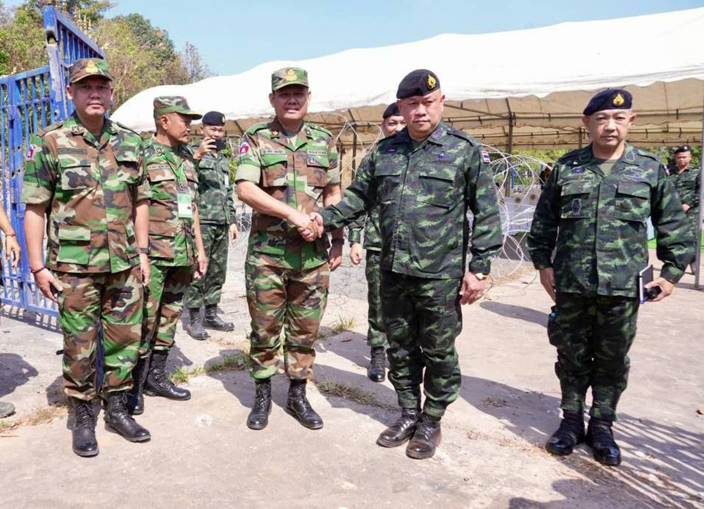 Brigadier General Nith Narong (4th L, Pic. 1), Deputy Chief of Staff of Cambodia’s 4th Military Region, shakes hands with Major General Kamphanat Waphansuk, Chief of Staff of Thailand’s 2nd Army Area, prior to a Secretariat Meeting between the two military regions, held at the Choam-Sa Ngam International Point of Entry in Anlong Veng district, Oddar Meanchey province, Kingdom of Cambodia, this morning under the observation of the ASEAN Observer Team (AOT) from both nations.