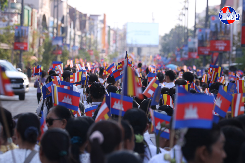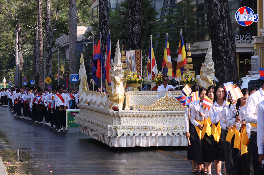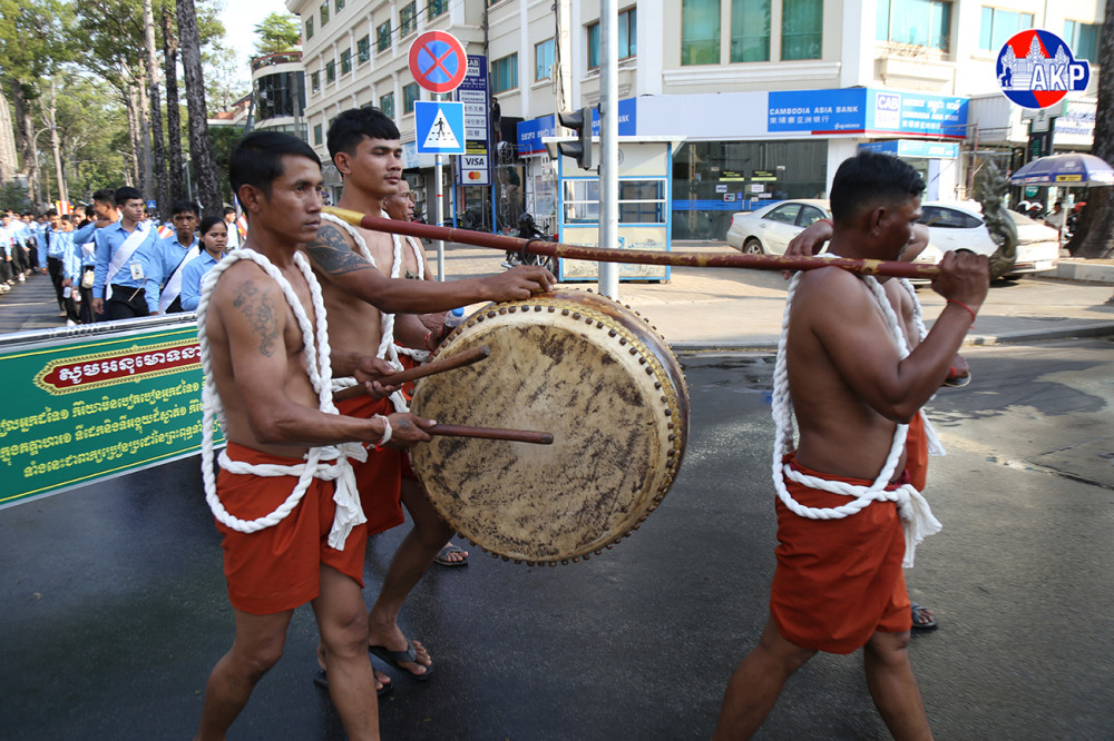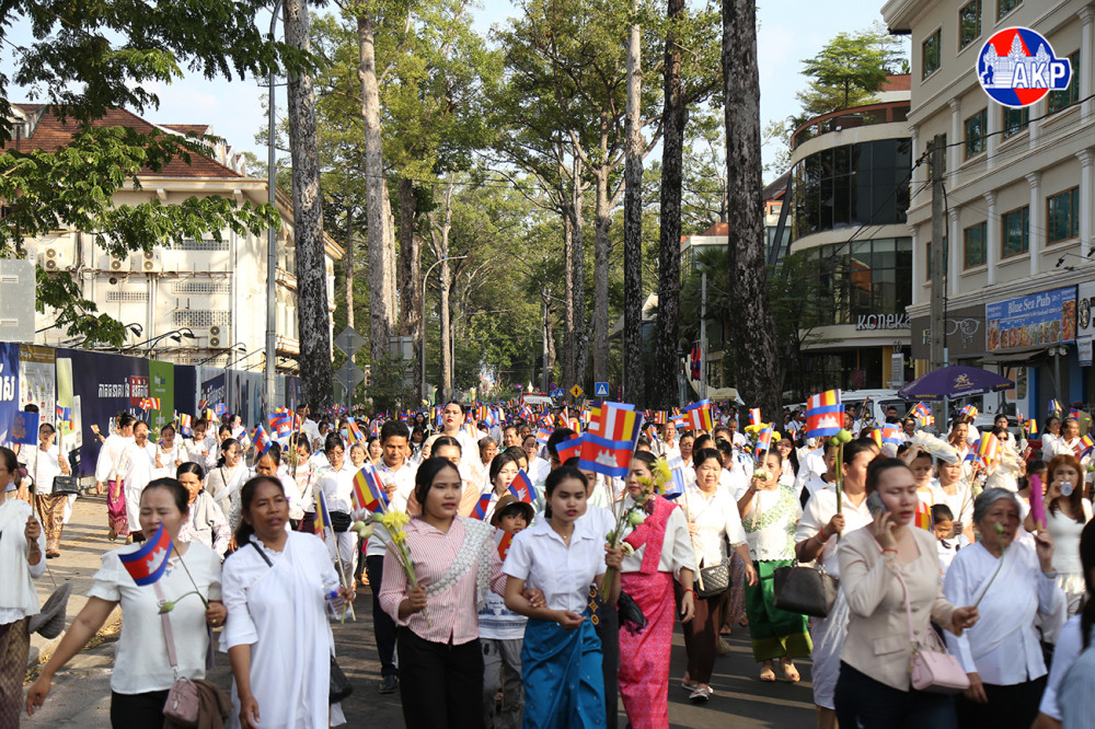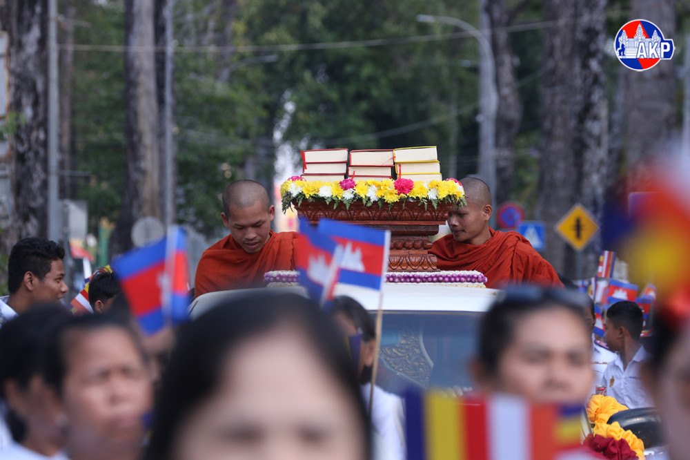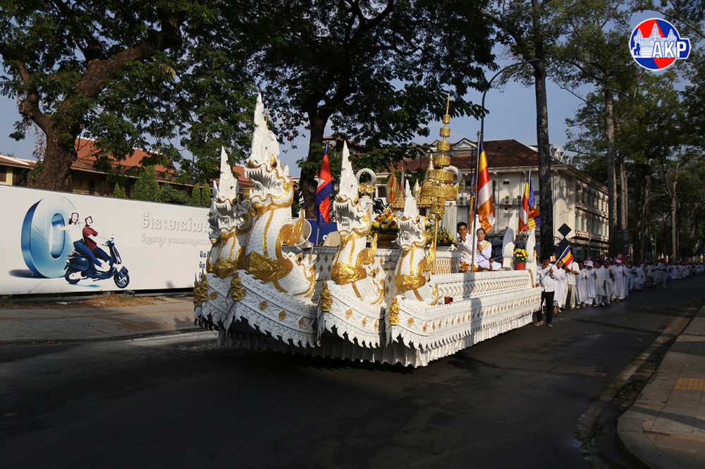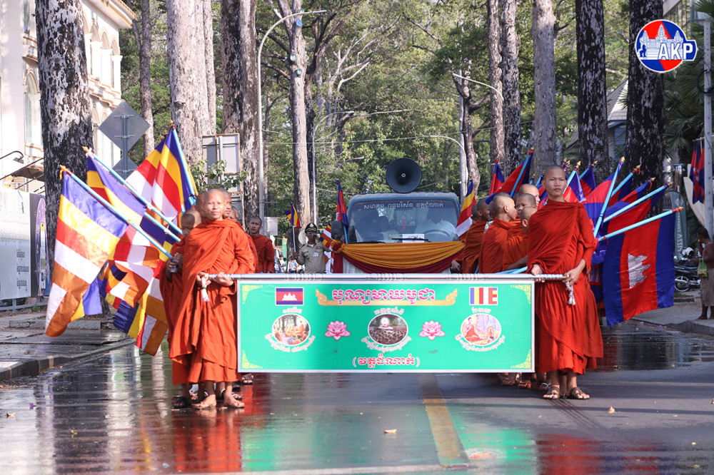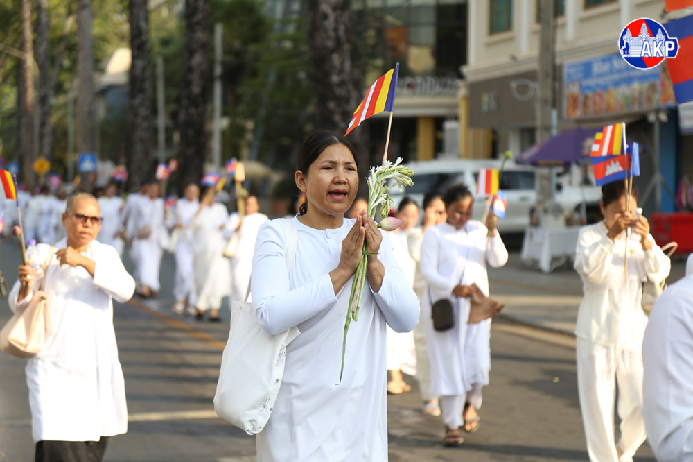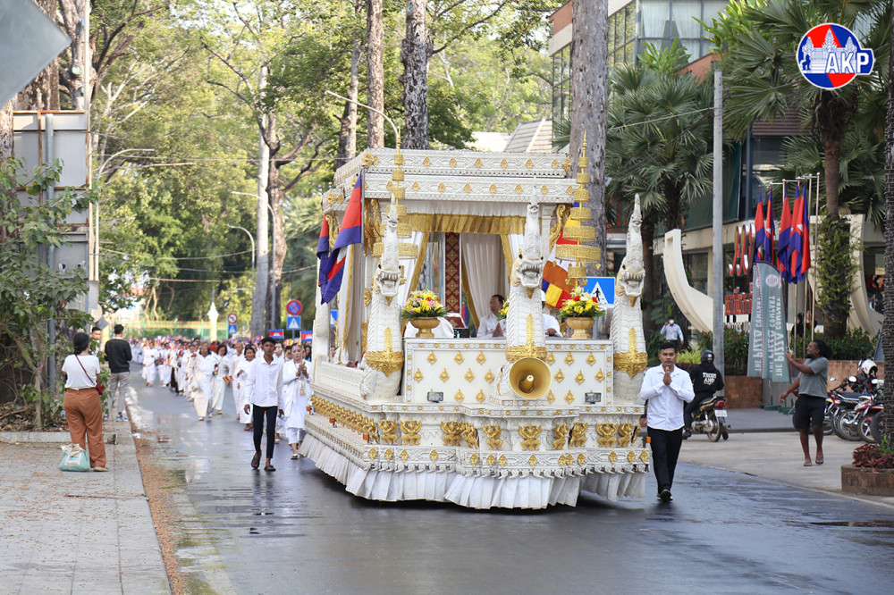Large numbers of Buddhist followers join a Meak Bochea procession along the main streets of Siem Reap provincial city this afternoon. The event was organised by Damnak Pagoda in collaboration with the Siem Reap Provincial Administration.