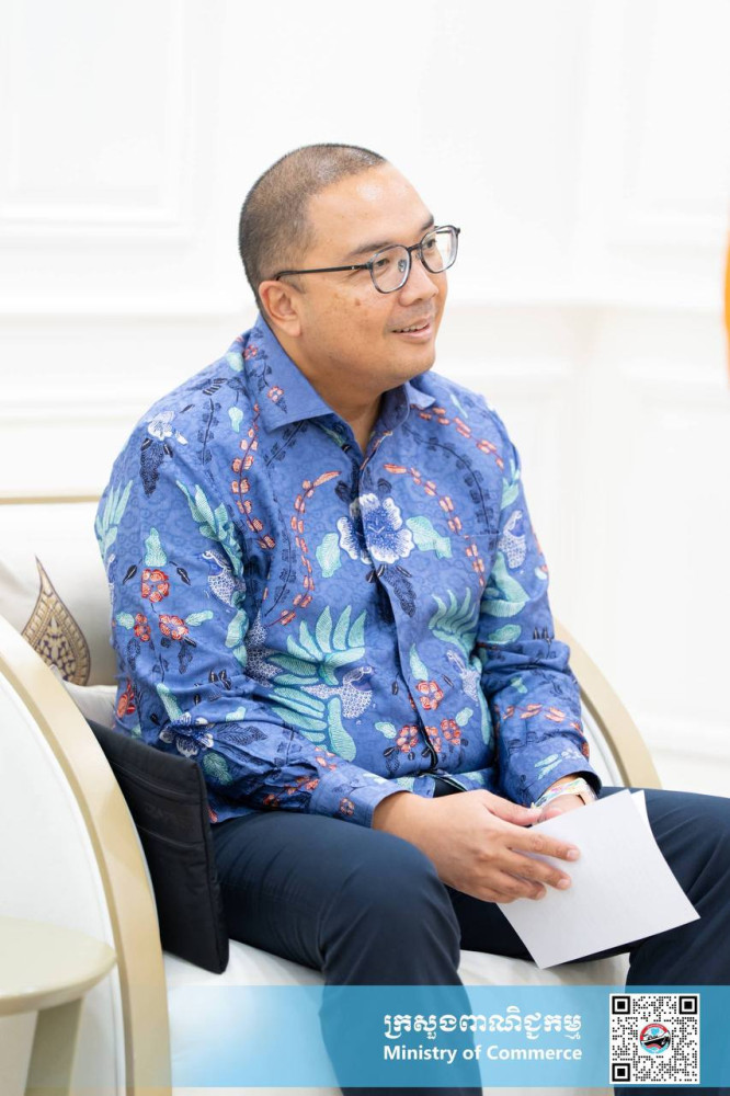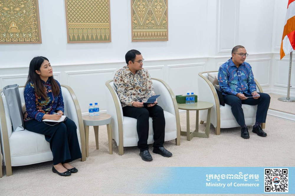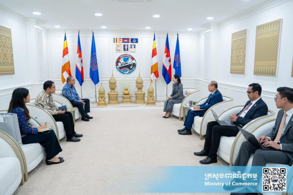 H.E Mrs. Cham Nimul (4th R, Pic. 1), Minister of Commerce, receives a farewell visit from H.E. Santo Darmosumarto (3rd L, Pic. 1), outgoing Ambassador Extraordinary and Plenipotentiary of the Republic of Indonesia to the Kingdom of Cambodia, at the Ministry this afternoon.