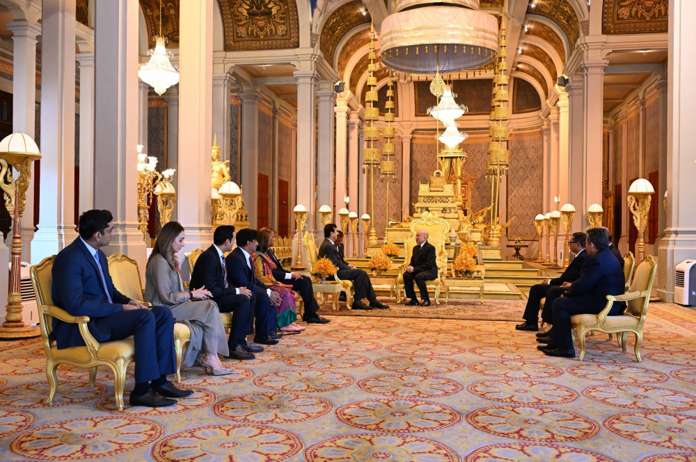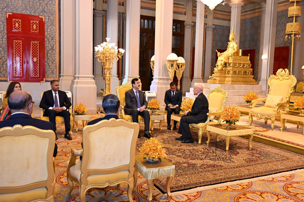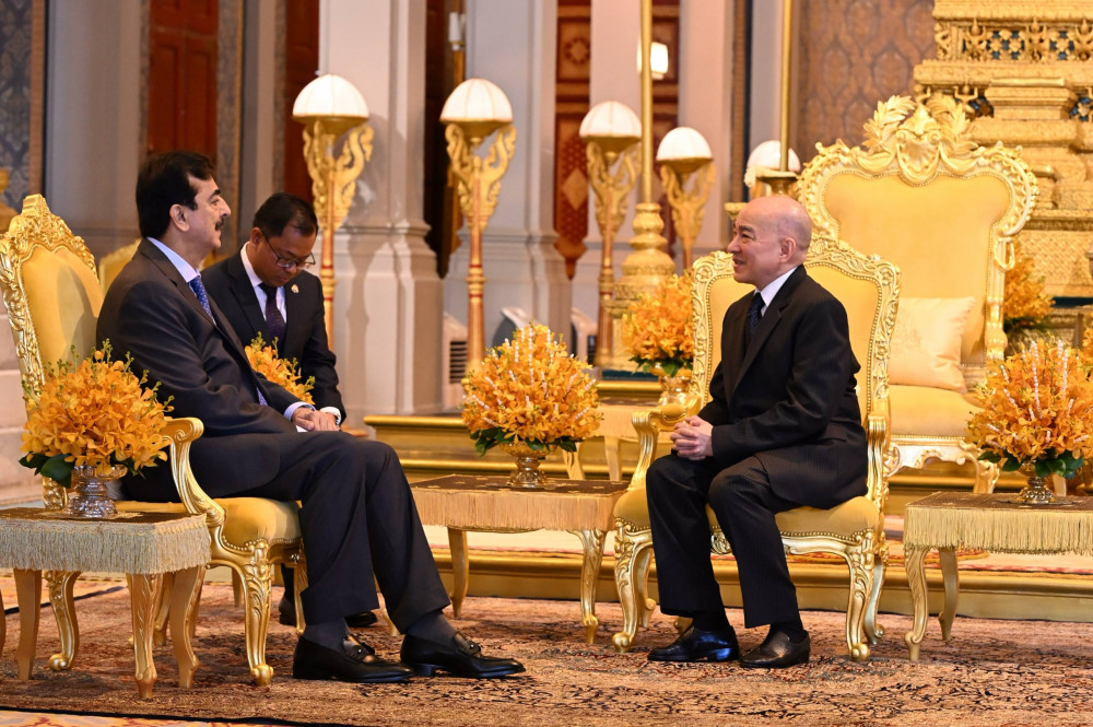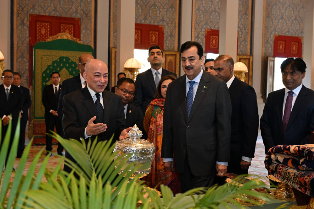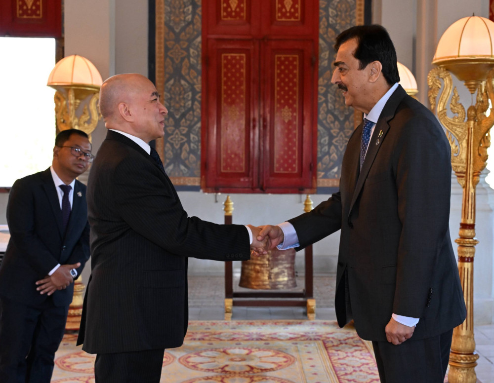 His Majesty Preah Bat Samdech Preah Boromneath Norodom Sihamoni (L, Pic. 1), King of Cambodia, greets visiting H.E. Syed Yusuf Raza Gillani, Honourable Chairman of the Senate of the Islamic Republic of Pakistan, prior to a royal audience at the Royal Palace in Phnom Penh this morning.