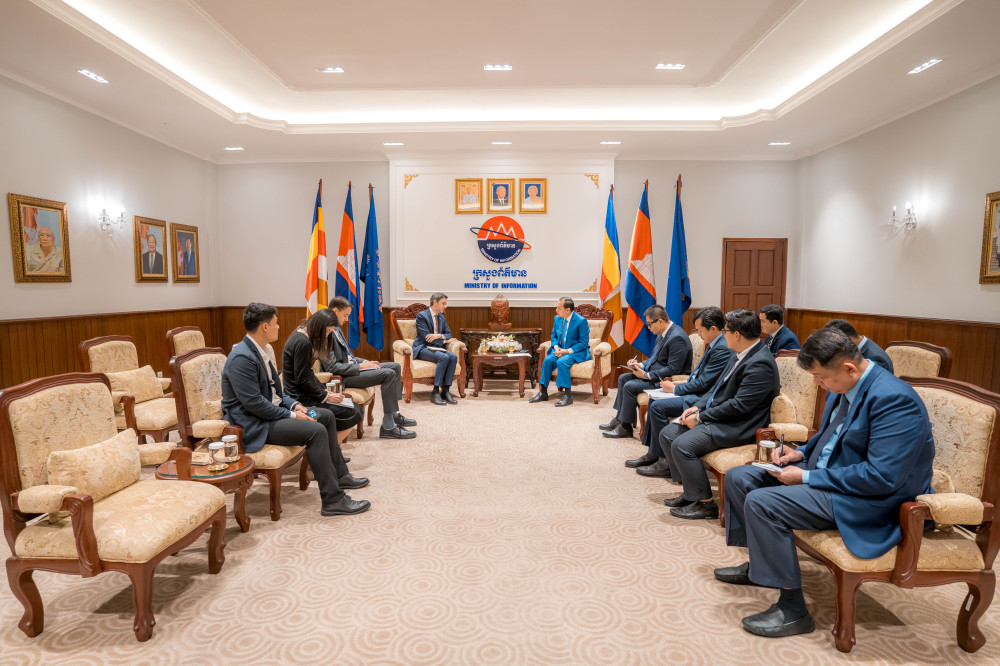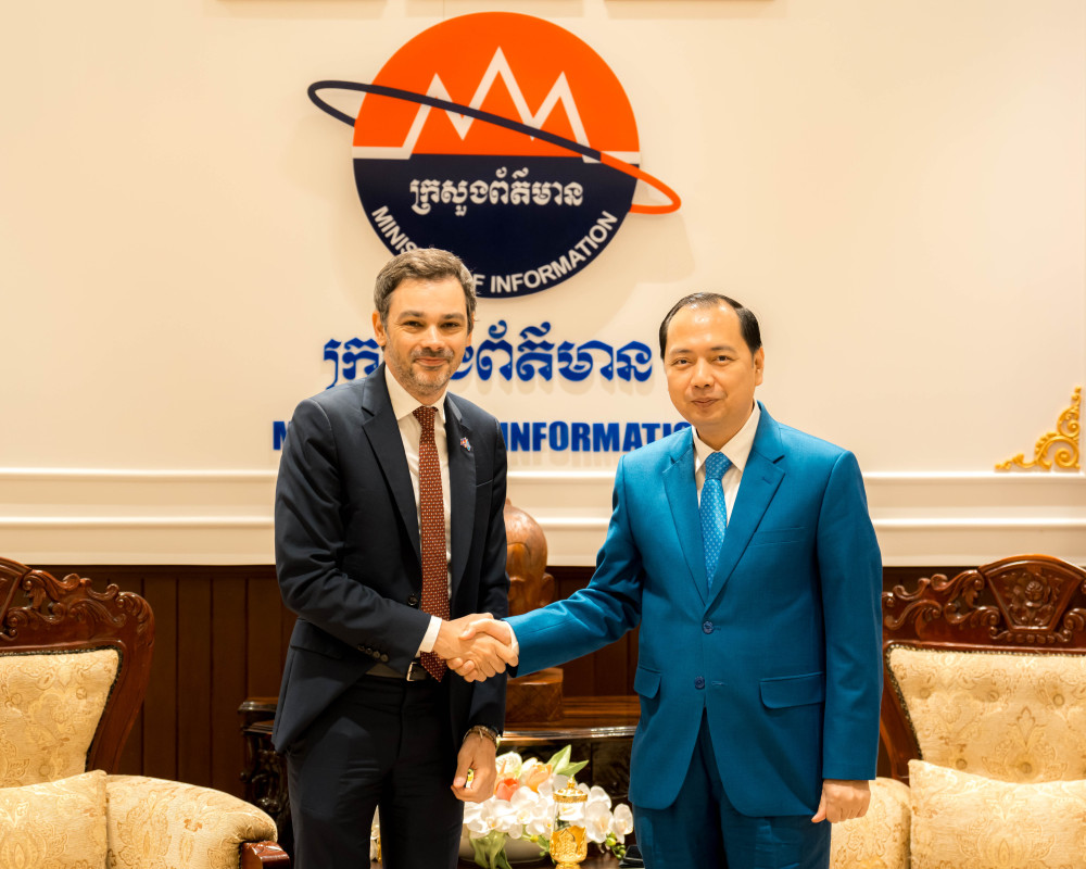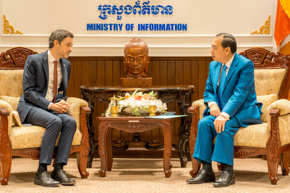 Minister of Information H.E. Neth Pheaktra (R, Pic. 1) shakes hands with Mr. Flavio Bonetti, new UNESCO representative in Cambodia, prior to their meeting at the Ministry this morning.