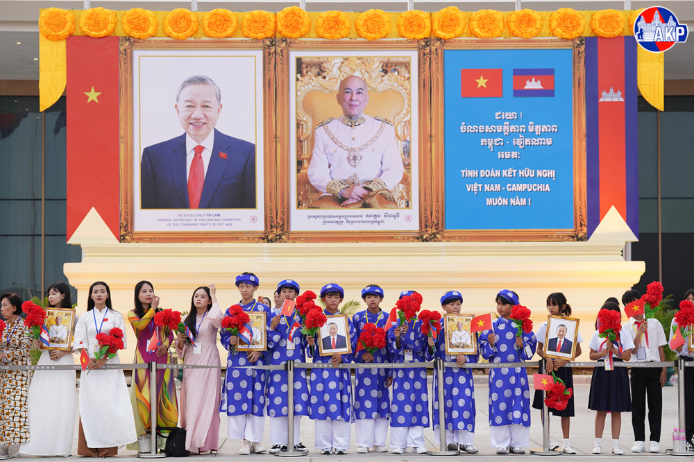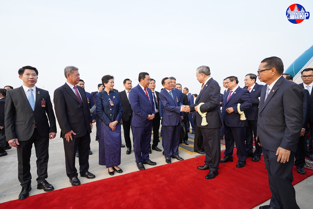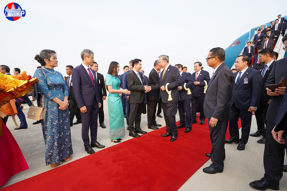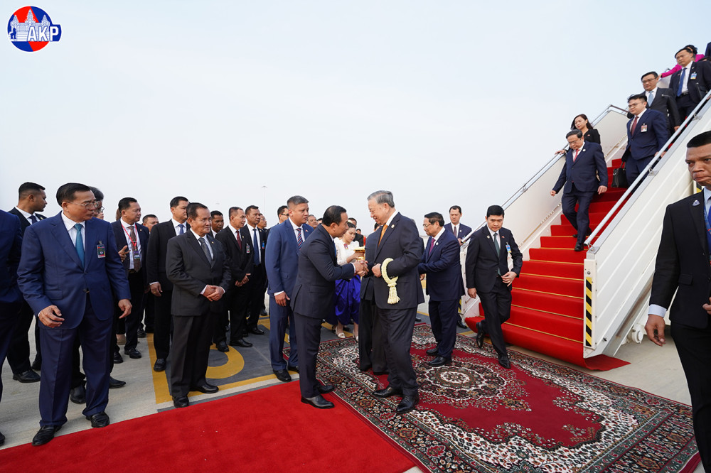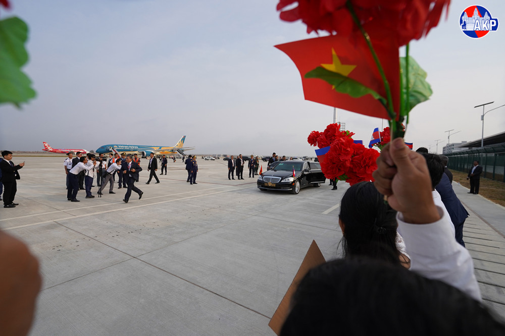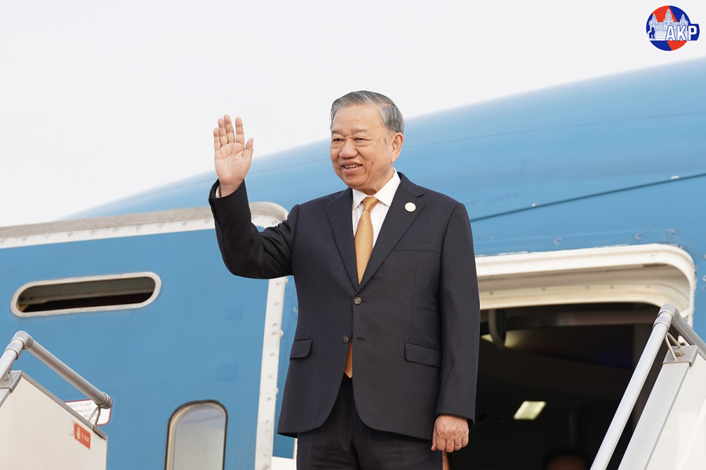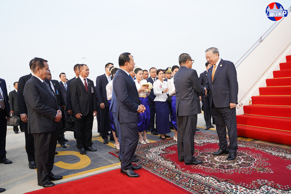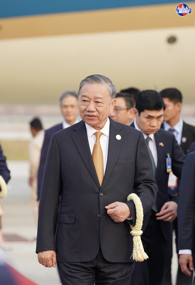 H.E. To Lam (Pic. 1), General Secretary of the Communist Party of Vietnam (CPV), disembarks from a special aircraft upon his arrival at Techo International Airport in Kandal province this morning for a day-long state visit to the Kingdom of Cambodia.
