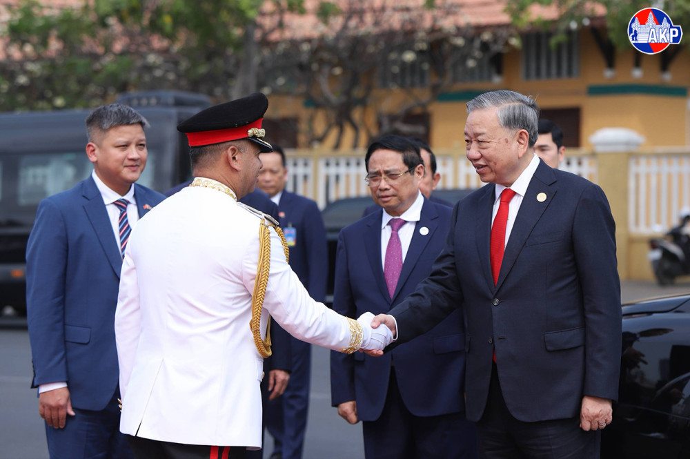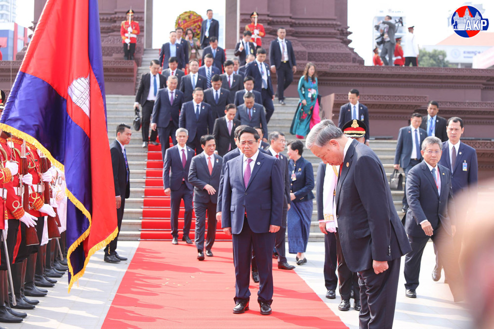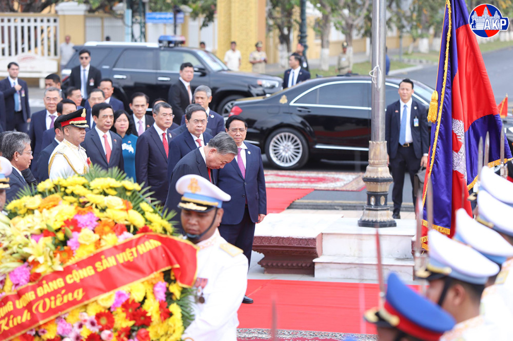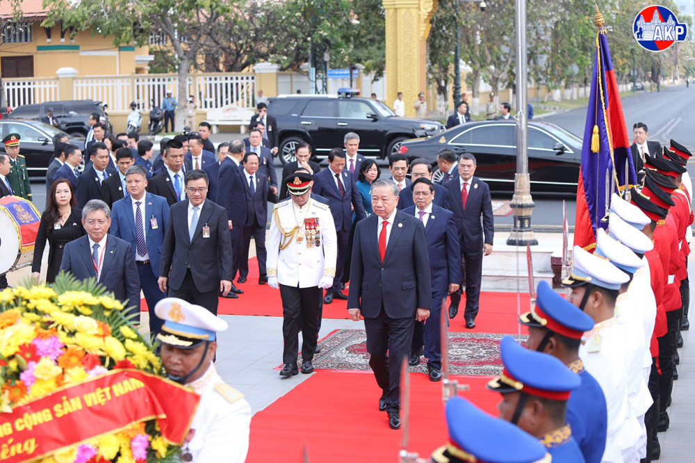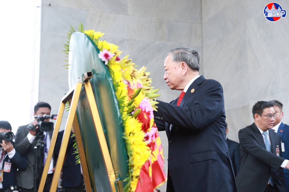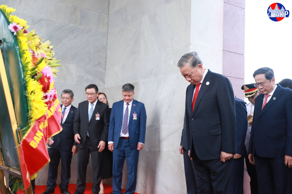 H.E. To Lam (Pic. 1), General Secretary of the Communist Party of Vietnam, lays a wreath and pays respects at the Independence Monument in Phnom Penh this morning, as part of his day-long state visit to the Kingdom of Cambodia.